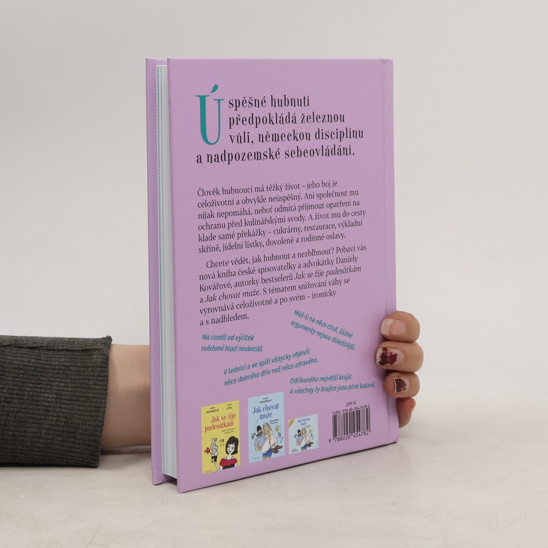 Člověk hubnoucí má těžký život – jeho boj je celoživotní a obvykle neúspěšný. Ani společnost mu nijak nepomáhá, neboť odmítá přijmout opatření na ochranu před kulinářskými svody. A život mu do cesty klade samé překážky – cukrárny, restaurace, výkladní skříně, jídelní lístky, dovolené a rodinné oslavy. Chcete vědět, jak hubnout a nezblbnout? Pobaví vás nová kniha české spisovatelky a advokátky Daniely Kovářové, autorky bestselerů Jak se žije padesátkám a Jak chovat muže. S tématem snižování váhy se vyrovnává po svém – ironicky a s nadhledem.
