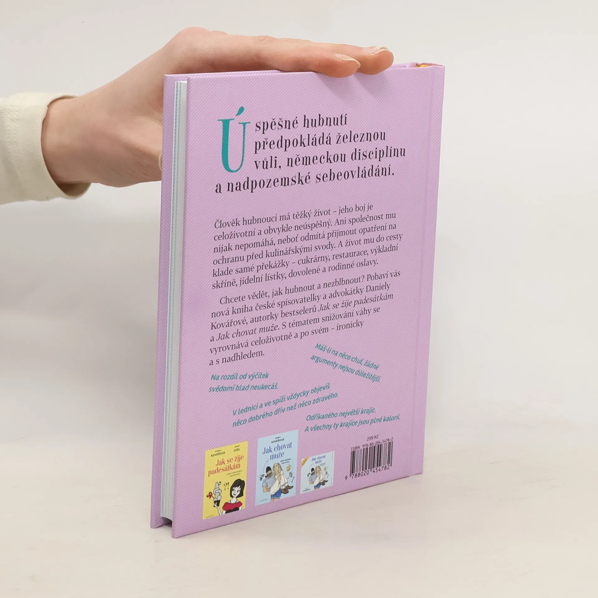 Člověk hubnoucí má těžký život – jeho boj je celoživotní a obvykle neúspěšný. Ani společnost mu nijak nepomáhá, neboť odmítá přijmout opatření na ochranu před kulinářskými svody. A život mu do cesty klade samé překážky – cukrárny, restaurace, výkladní skříně, jídelní lístky, dovolené a rodinné oslavy. Chcete vědět, jak hubnout a nezblbnout? Pobaví vás nová kniha české spisovatelky a advokátky Daniely Kovářové, autorky bestselerů Jak se žije padesátkám a Jak chovat muže. S tématem snižování váhy se vyrovnává po svém – ironicky a s nadhledem.