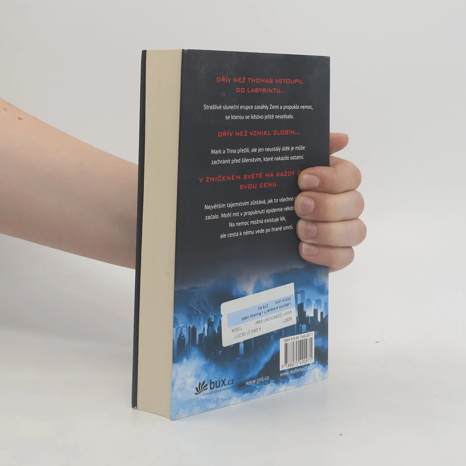 Prequel úspěšné sci-fi série „Labyrint“. Ještě předtím, než byl ustaven ZLOSIN, ještě předtím, než Thomas vstoupil do labyrintu, zasáhly Zemi sluneční erupce a propukla nemoc, se kterou se lidstvo dosud nesetkalo. Mark a Trina přežili erupce, ale to se ukázalo jen jako rozcvička před hrůzami, které je čekají. Nemoc, která se projevuje agresí a šílenstvím, zachvacuje postupně celý kontinent, a nikdo neví, odkud se strašlivý virus vzal. Panují pochybnosti, že v tom mohl být něčí zvrácený zájem… Mark a Trina jsou přesvědčeni, že existuje způsob, jak zachránit ty, které nemoc ještě nezničila. Jejich cesta za lékem na erupci je ale trnitá. V zdevastovaném světě má každý svou cenu, a oni by byli nejcennější jako mrtví...