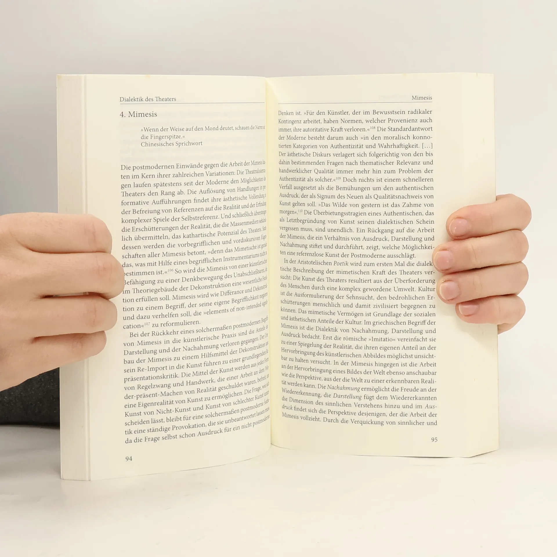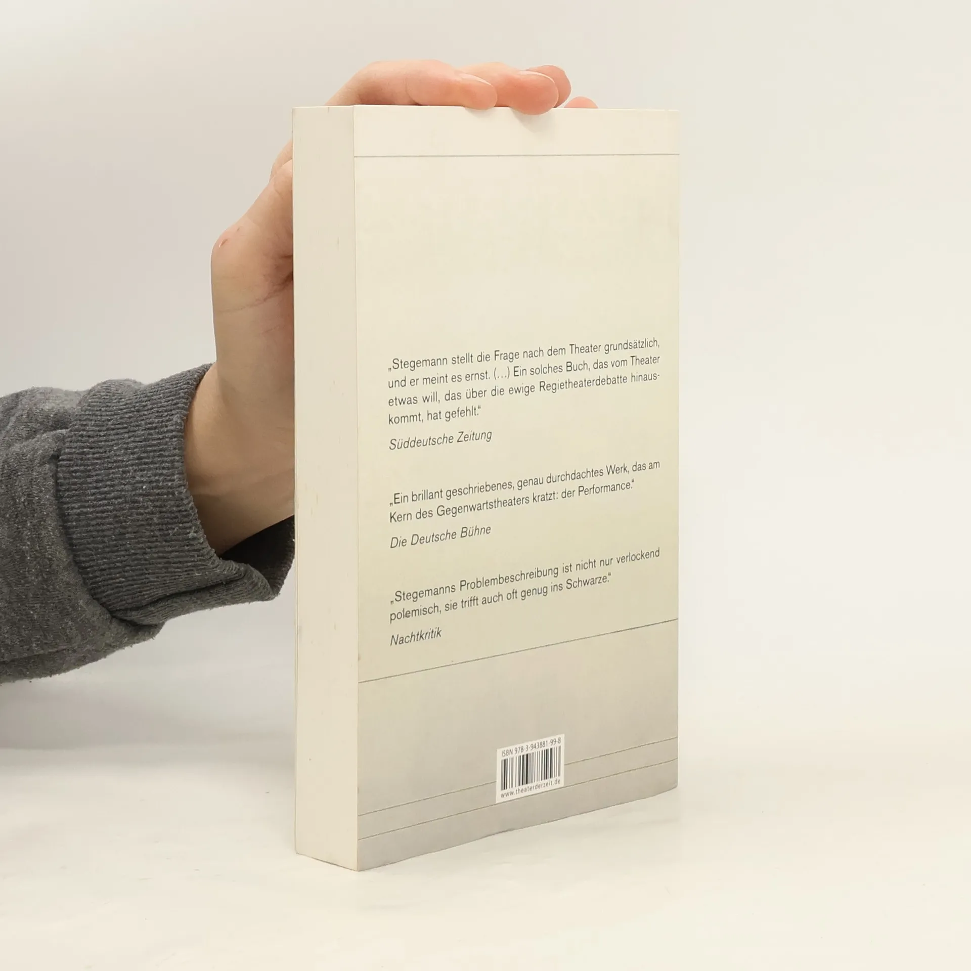 Die Sehnsucht des Theaters gilt der Darstellung des Menschen, eine Tatsache, die von Bernd Stegemann, dem profiliertesten Kritiker der Postdramatik, zu Unrecht in Zweifel gezogen wurde. Statt Mimesis, Spiel und Bedeutung dominieren Selbstreferenz, Ironie und Performativität. In der Postdramatik erscheint Realität als Simulation, wobei alle Ereignisse Zeichen ihrer selbst sind und mit dem Anschein von Authentizität kokettieren. Diese Spiele stören die kapitalistisch organisierte Gesellschaft nicht, die mit fiktivem Geld agiert, das im Leben der Menschen eine verblüffend echte Rolle spielt. Stegemanns "Kritik des Theaters" ist eine grundlegende Auseinandersetzung mit der Beschränkung auf postdramatische Formen und ein Plädoyer für die Wiederbelebung der Kritikfähigkeit des Theaters. Das Theater hat die Fähigkeit, das Unsichtbare sichtbar zu machen und die Realität nicht zu verdoppeln, sondern sie zur Enthüllung zu zwingen. Es spielt mit den Dingen hinter dem Schein und bringt die Totalität der Erscheinungen momentweise zur Schau. Solange das Theater den Zusammenhang von postmoderner Ästhetik, Neoliberalismus und der Produktion egoistischer Subjektivität nicht reflektiert, kann es kein kritisches Verhältnis zur Gegenwart einnehmen. „Ein brillant geschriebenes Werk, das am Kern des Gegenwarttheaters kratzt: der Performance.“ – Die Deutsche Bühne.