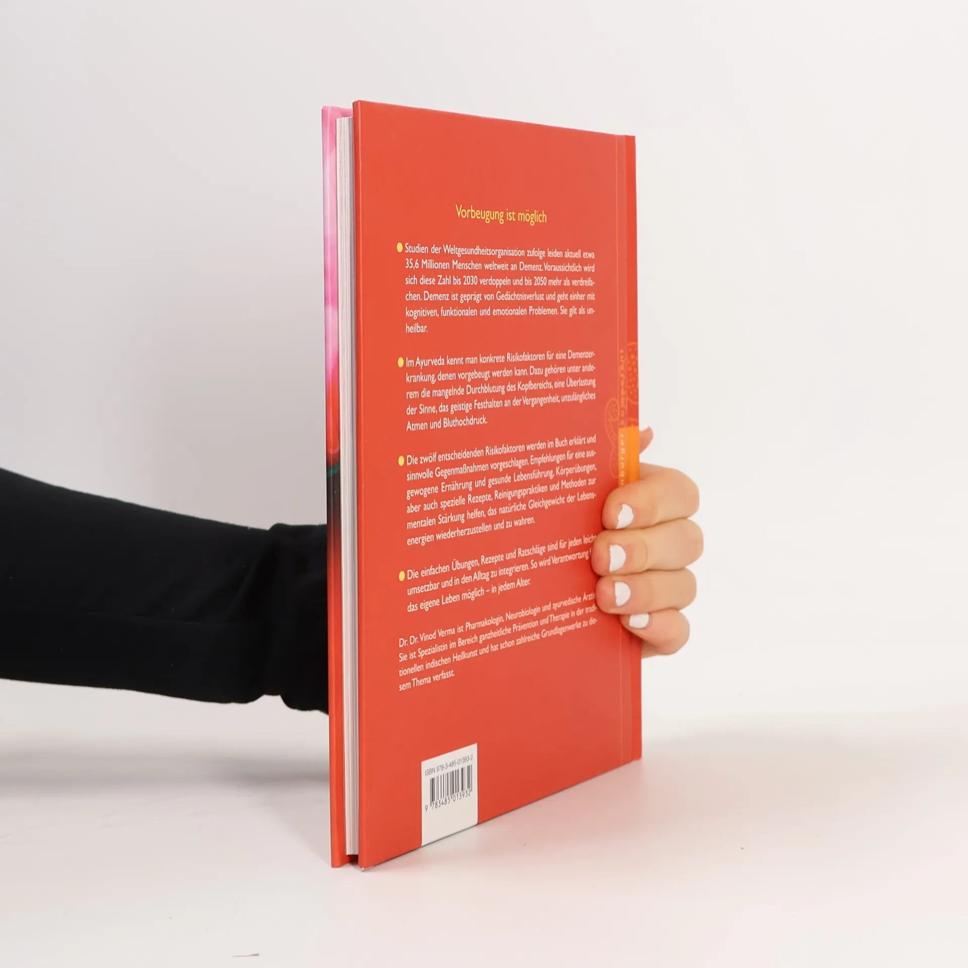 Im Ayurveda kennt man konkrete Risikofaktoren für eine Demenzerkrankung. Dazu gehören u. a. die mangelnde Durchblutung des Kopfbereichs, eine starke Überbetonung des Verstandes, das geistige Festhalten an der Vergangenheit, die Angst vor Demenz und eine falsche Ernährung. Experten gehen davon aus, dass sich die Zahl der Demenzkranken bis zum Jahr 2030 verdoppeln wird. Bereits heute leiden allein in Deutschland 1,2 Millionen Menschen an Demenz. Vinod Verma stellt die spezifischen Methoden des Ayurveda und Yoga vor, die die Risikofaktoren minimieren. So wird Verantwortung für das eigene Leben möglich.
