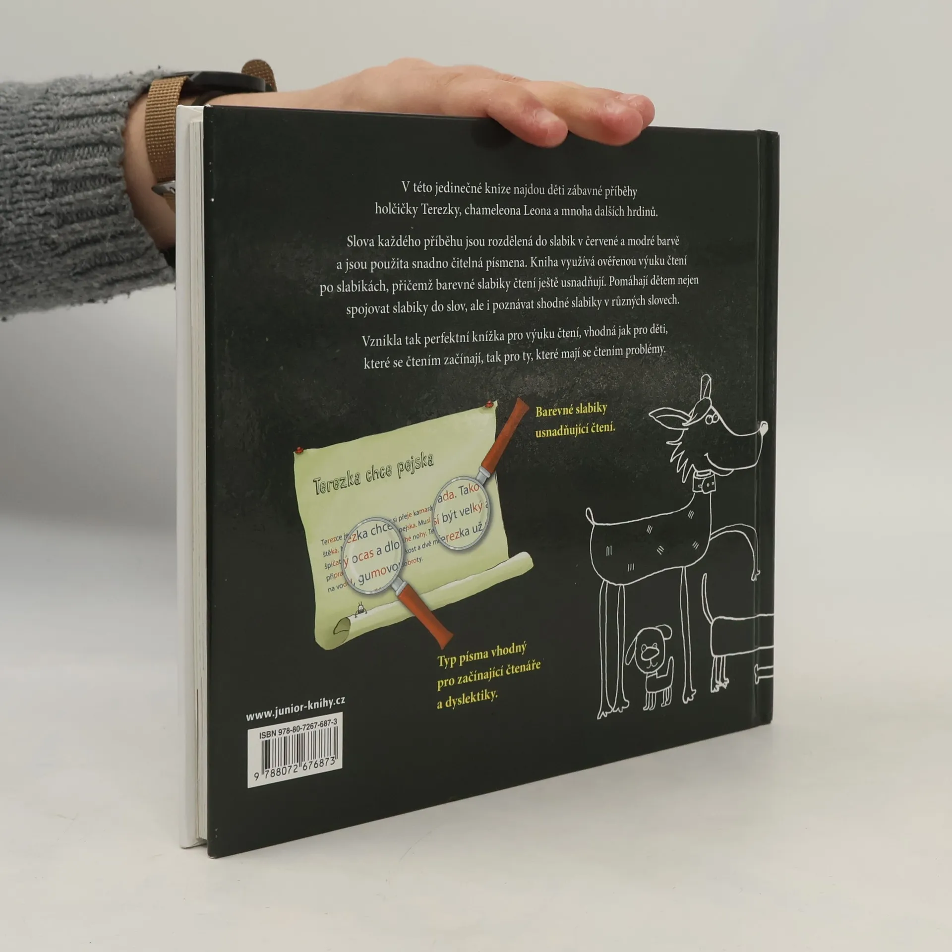 V této jedinečné knize najdou děti zábavné příběhy holčičky Terezky, chameleona Leona a mnoha dalších hrdinů. Slova každého příběhu jsou rozdělená do slabik v červené a modré barvě a jsou použita snadno čitelná písmena. Kniha využívá ověřenou výuku čtení po slabikách, přičemž barevné slabiky čtení ještě usnadňují. Pomáhají dětem nejen spojovat slabiky do slov, ale i poznávat shodné slabiky v různých slovech. Vznikla tak perfektní knížka pro výuku čtení, vhodná jak pro děti, které se čtením začínají, tak pro ty, které mají se čtením problémy. Pro děti od šesti let.