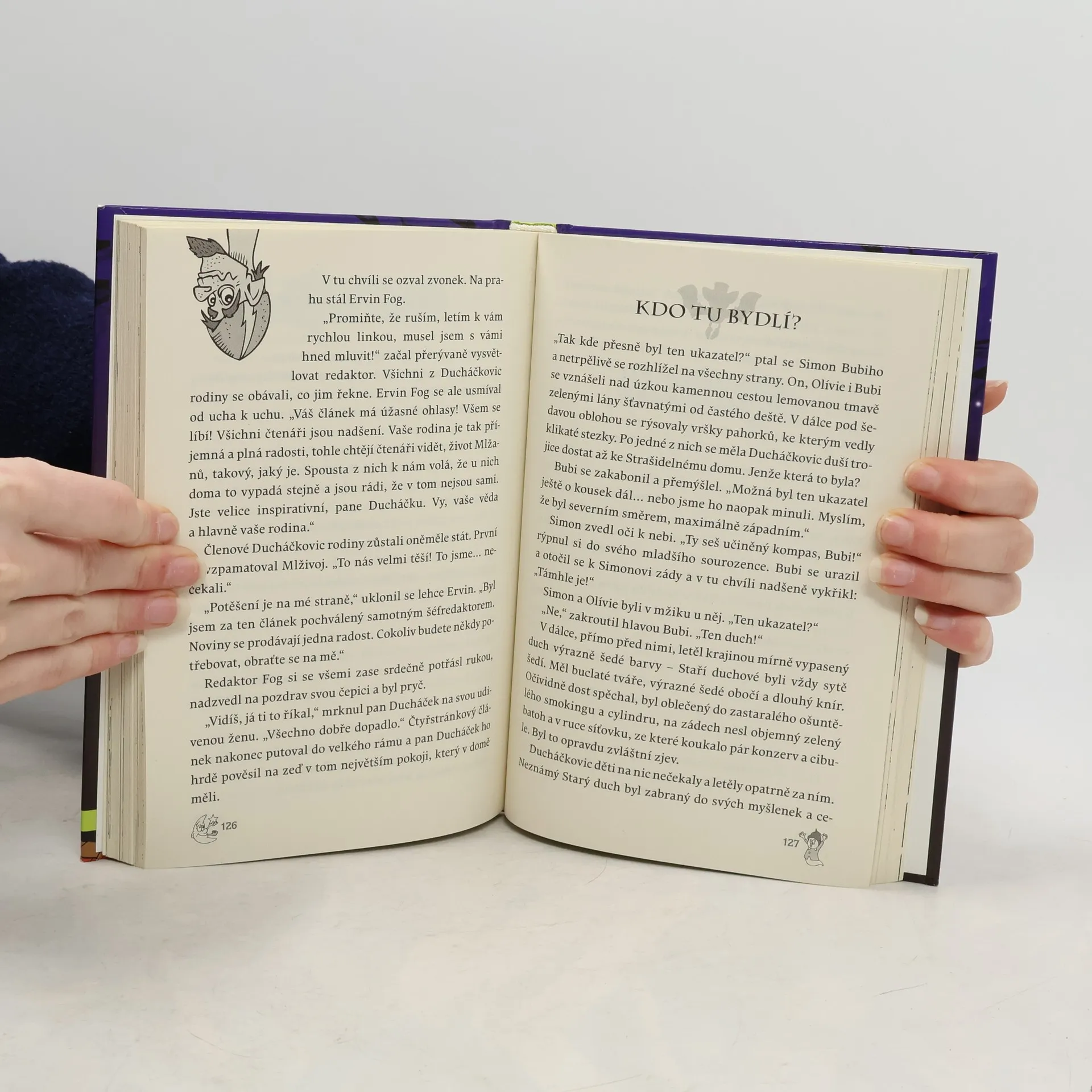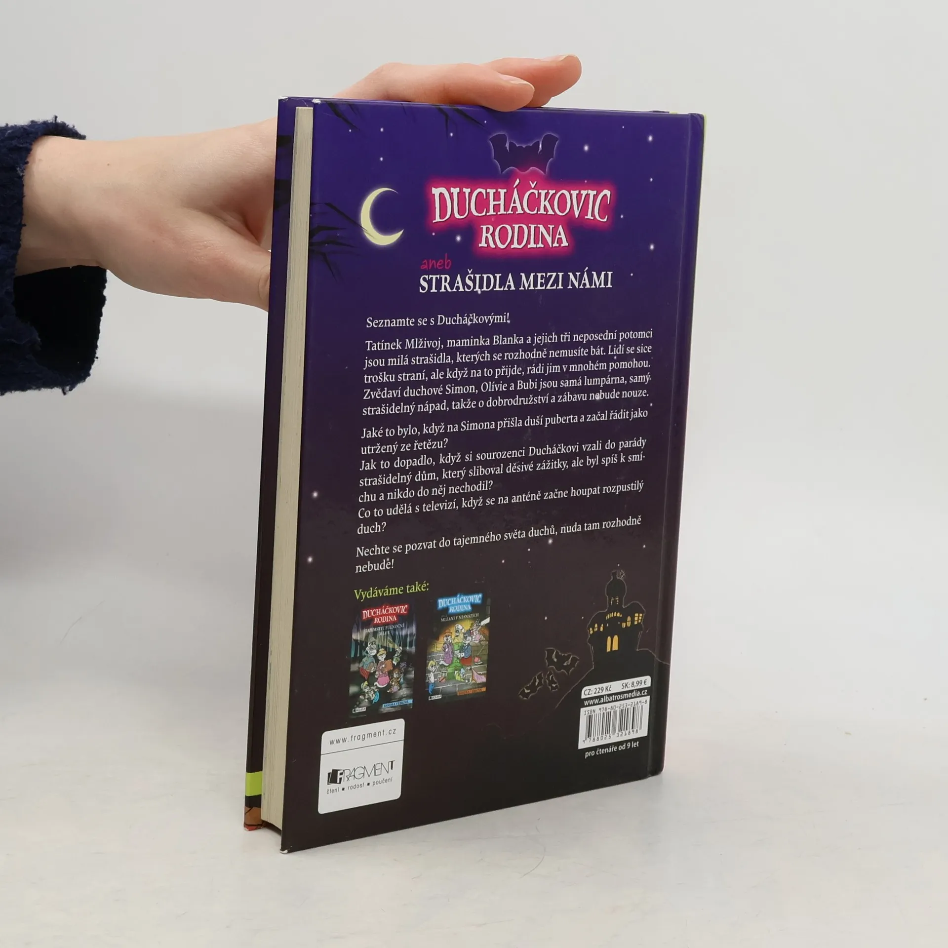 Seznamte se s Ducháčkovými! Tatínek Mlživoj, maminka Blanka a jejich tři neposední potomci, jsou milá strašidla, kterých se rozhodně nemusíte bát. Lidí se sice trošku straní, ale když na to přijde, rádi jim v lecčem pomohou. Nezbedové Simon, Olivie a Bubi jsou samá lumpárna a skopičina, takže o dobrodružství a zábavu nebude nouze. Jaké to bylo, když na Simona přišla duší puberta a začal řádit jako utržený ze řetězu? Jak to dopadlo, když si sourozenci Ducháčkovi vzali do parády strašidelný zámek, který sliboval děsivé zážitky, ale byl spíš k smíchu, a nikdo do něj nechodil? Co to udělá s televizí, když se na anténě začne houpat rozpustilý duch? Nechte se pozvat do tajemného světa duchů, nuda tam rozhodně nebude! První vydání.