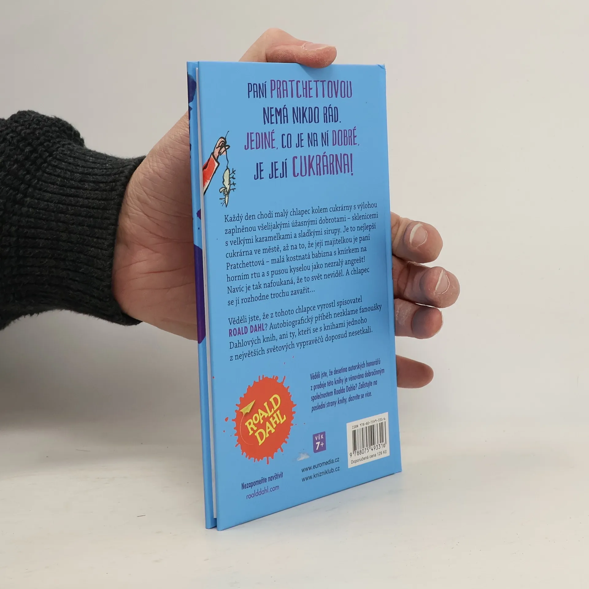 Každý den chodí malý chlapec kolem cukrárny s výlohou zaplněnou všelijakými úžasnými dobrotami – sklenicemi s velkými karamelkami a sladkými sirupy. Je to nejlepší cukrárna ve městě, až na to, že její majitelkou je paní Pratchettová – postarší vytáhlá babizna se špínou za nehty! Navíc je tak nafoukaná, že to svět neviděl. A chlapec se jí rozhodne trochu zavařit… Věděli jste, že z tohoto chlapce vyrostl spisovatel Roald Dahl? Autobiografický příběh nezklame fanoušky Dahlových knih, ani ty, kteří se s knihami jednoho z největších světových vypravěčů doposud nesetkali. Kniha je určena pro děti od 7 let.
