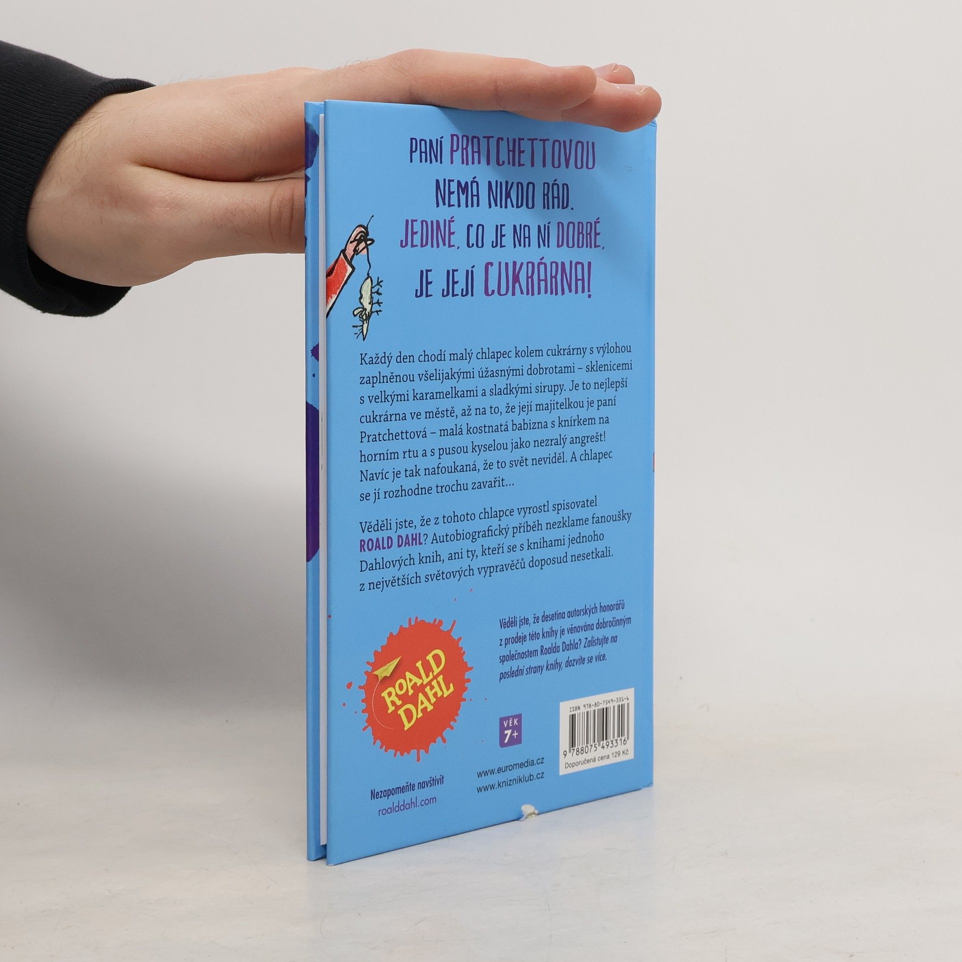 Každý den chodí malý chlapec kolem cukrárny s výlohou zaplněnou všelijakými úžasnými dobrotami – sklenicemi s velkými karamelkami a sladkými sirupy. Je to nejlepší cukrárna ve městě, až na to, že její majitelkou je paní Pratchettová – postarší vytáhlá babizna se špínou za nehty! Navíc je tak nafoukaná, že to svět neviděl. A chlapec se jí rozhodne trochu zavařit… Věděli jste, že z tohoto chlapce vyrostl spisovatel Roald Dahl? Autobiografický příběh nezklame fanoušky Dahlových knih, ani ty, kteří se s knihami jednoho z největších světových vypravěčů doposud nesetkali. Kniha je určena pro děti od 7 let.