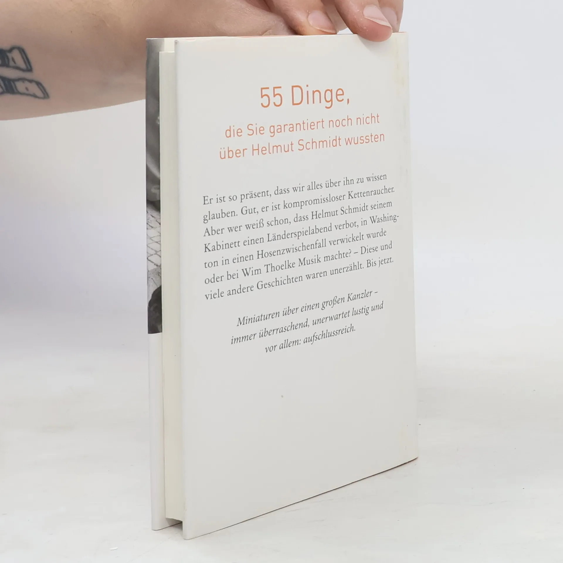 55 Dinge, die Sie garantiert noch nicht über Helmut Schmidt wussten Er ist so präsent, dass wir alles über ihn zu wissen glauben. Gut, er ist kompromissloser Kettenraucher. Aber wer weiß schon, dass Helmut Schmidt seinem Kabinett einen Länderspielabend verbot, in Washington in einen Hosenzwischenfall verwickelt wurde oder bei Wim Thoelke Musik machte? – Diese und viele andere Geschichten waren unerzählt. Bis jetzt. Miniaturen über einen großen Kanzler – immer überraschend, unerwartet lustig und vor allem: aufschlussreich.