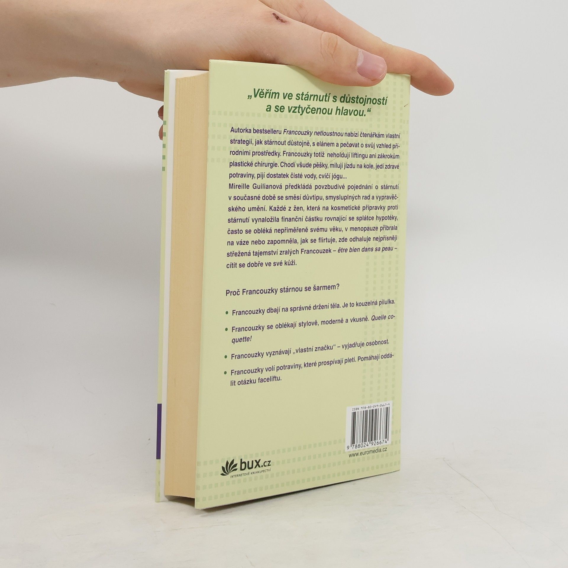 Tajemství, jak neztratit šarm. Autorka patří mezi ty Francouzky, které jsou údajně nejšťastnější ve zralém věku. Už nemusí hledat práci, nedychtí po kariéře, mají stálé přátele, zavedenou domácnost a umí přijímat libůstky i omezení. Dozvíte se tajemství péče o vzhled, jaké sportovní aktivity jsou nejvhodnější, jaký význam má spánek a snídaně pro zralé ženy. Autorka poodhalí vlastní formuli, která zlepší váš život, vzhled a zdraví, bude vám přinášet spokojenost a pomůže vám cítit se dobře ve své kůži v každém věku.