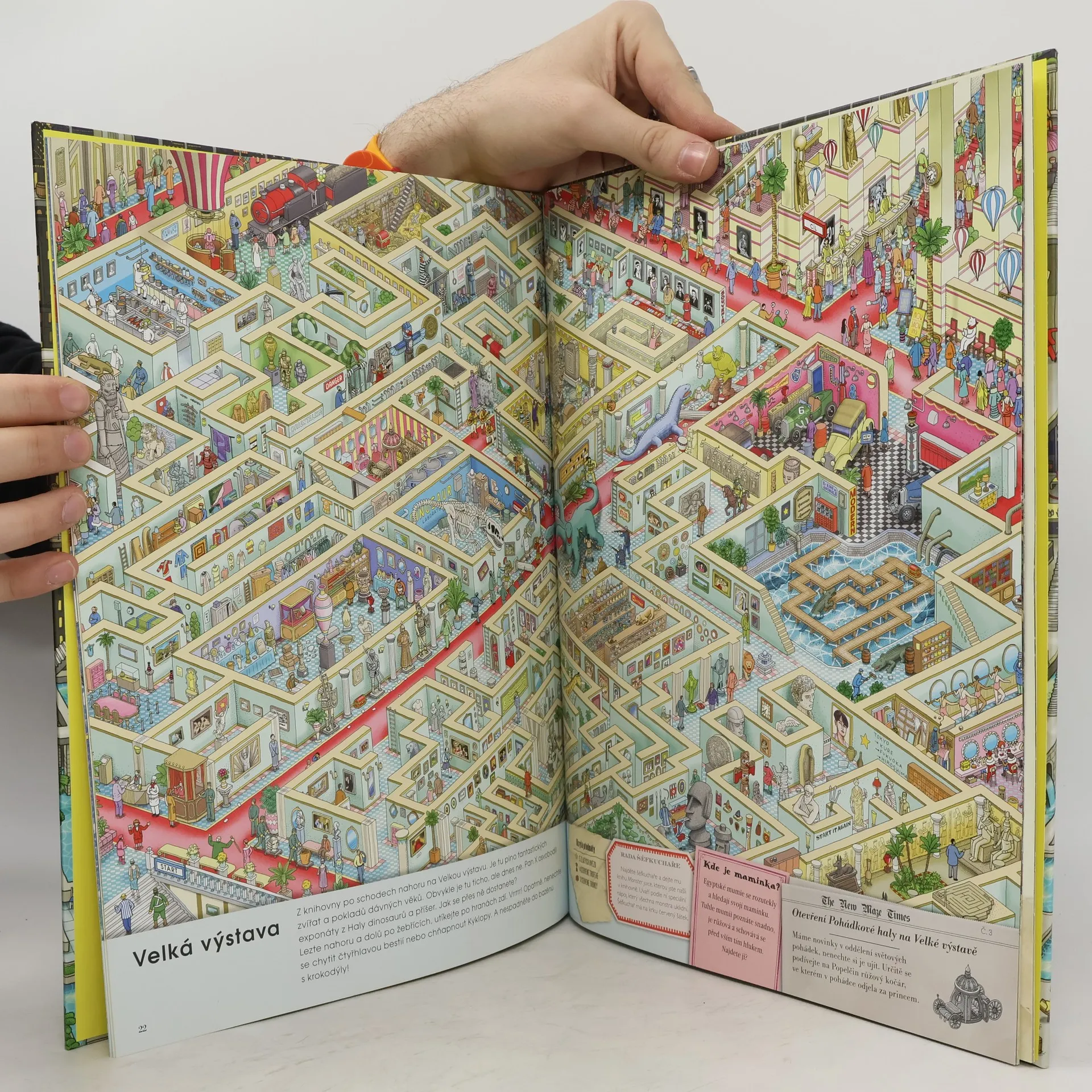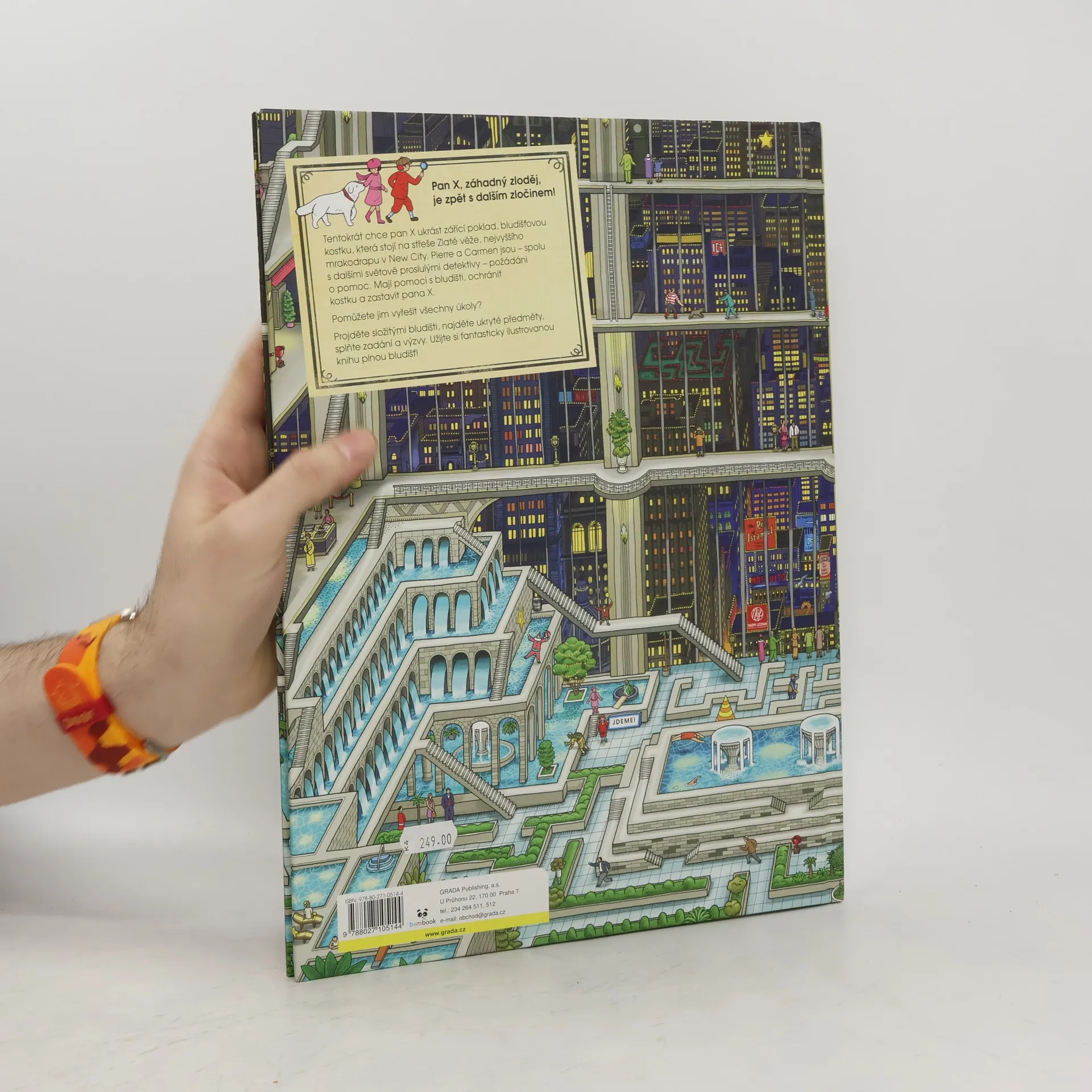 Tajemný zloděj pan X je zpět a má další nebezpečný plán! Chce ukrást největší poklad Nového města - zářící bludišťovou kostku z vrcholu Zlaté věže. Vlastník věže povolá do města několik nejlepších detektivů včetně Pierra, specialisty na bludiště, a jeho kamarádky Carmen. Všichni se snaží drahocennou kostku zachránit a hlavně zastavit pana X. Ale stihnou to včas? Projdi si všechna ďábelsky složitá bludiště, najdi ukryté předměty, vyřeš zvláštní výzvy pana X a další drobné záhady na každé stráce této báječněilustrované knihy.