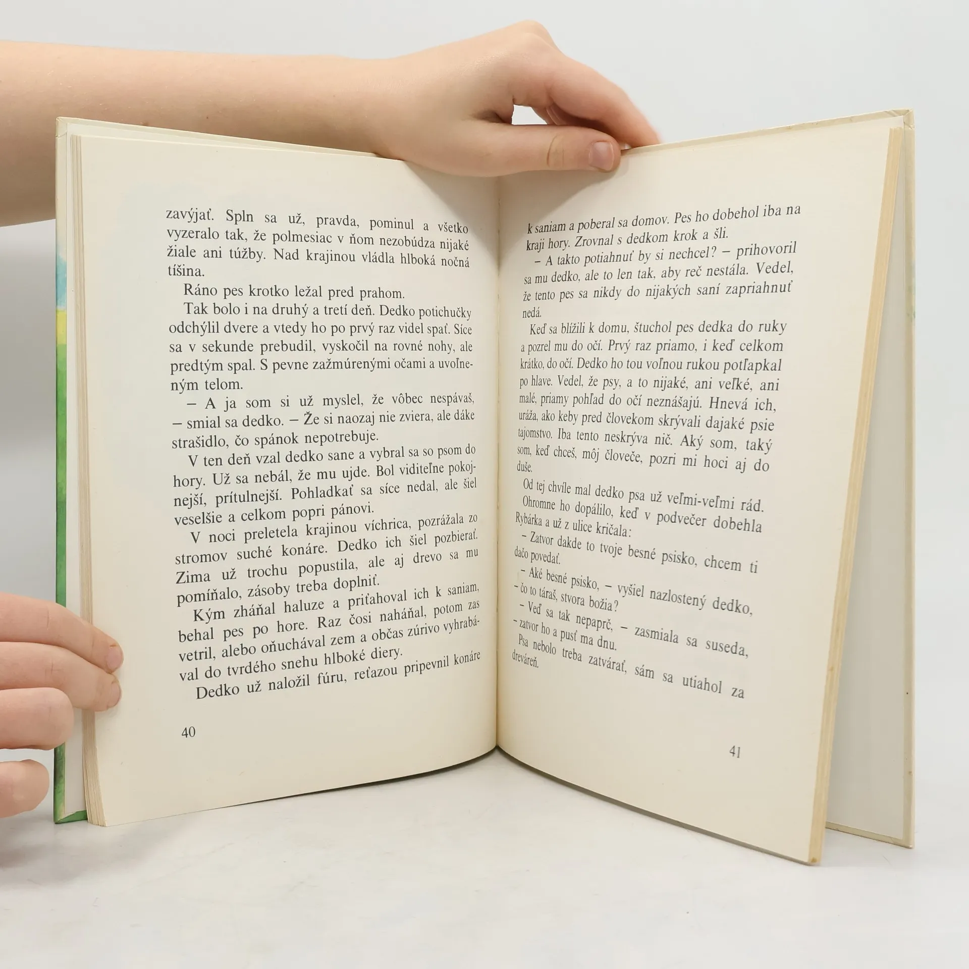 Ráno v jeden zimný studený deň sa starý pán Hronec vyberie na prechádzku, rozhýbať skrehnuté kosti. Dedko ide ka jazeru pozrieť ryby, svoje letné kamarátky. Chce vedieť, ako si žijú, zakované pod ľadovým príkrovom. Či im vôbec dakto vysekal v ľade diery, aby mali vzduch. Z drevárne si vzal metlu a sekeru. Kochá sa nádhernou snehobielou krajinou, keď tu zrazu zazrie psa. Na snehovom kopci sedel pes. Dlhými prednými nohami sa zapieral do snehu. Zdola dedko jasne videl na mocných labách aj čierne pazúry. Mierne sklonená hlava so vztýčenými ušami svedčila o tom, že pes už dlho pozoruje dedka na ľadovej ploche.
