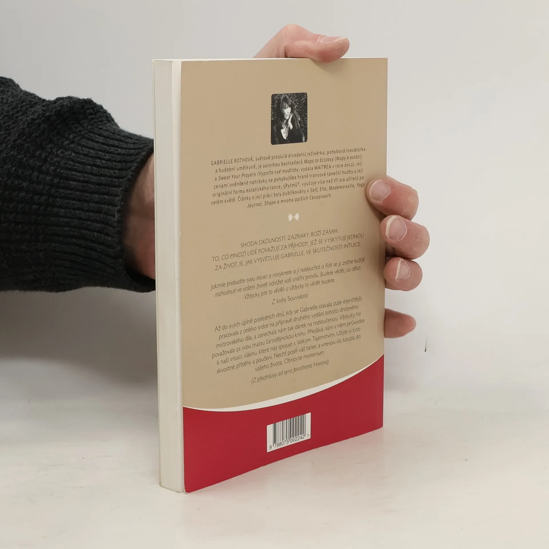 GABRIELLE ROTHOVÁ, světově proslulá divadelní režisérka, pohybová inovátorka a hudební umělkyně, je autorkou bestsellerů Maps to Ecstasy (Mapy k extázi) a Sweat Your Prayers (Vypoťte své modlitby, vydala MAITREA v roce 2012). Její cenami ověnčené nahrávky se pohybují na hraně transové taneční hudby a její originální formu extatického tance, 5Rytmů©, vyučuje více než tři sta učitelů po celém světě. Až do svých úplně posledních dnů, kdy se autorka stávala stále éteričtější, pracovala z celého srdce na přípravě druhého vydání tohoto drobného mistrovského díla, a zanechala nám tak dárek na rozloučenou. Vždycky ho považovala za svou malou čarodějnickou knihu. Předává nám v něm průvodce k naší intuici, vláknu, které nás spojuje s Velkým Tajemstvím. Užijte si tyto skvostné příběhy a poučení. Nechť posílí váš tanec a vnesou víc kouzla do vašeho života. Obnovte mysterium.