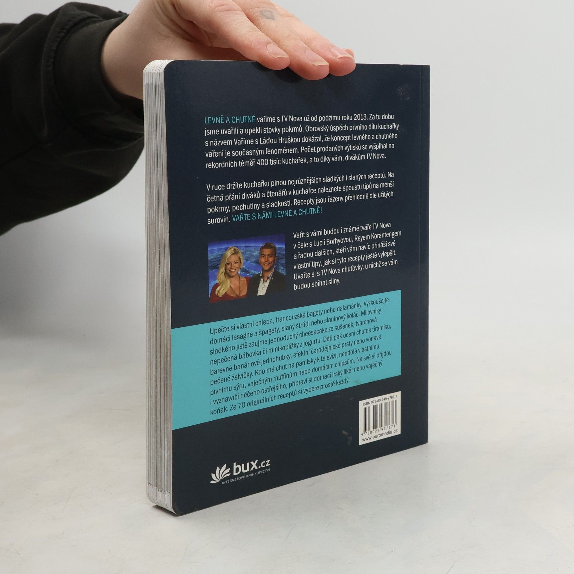 Vařit levně a chutně, to je současný trend všech fanoušků oblíbené rubriky televize Nova, ve které se připravují unikátní recepty za pár korun. Jednoduchý postup, časová nenáročnost a chutný výsledek – to sice zní jako nedostižný ideál, ale s nápaditými pokrmy z této kuchařky to půjde samo! Upečte si vlastní chleba, francouzské bagety nebo dalamánky. Vyzkoušejte domácí lasagne a špagety, slaný štrúdl nebo slaninový koláč. Milovníky sladkého jistě zaujme jednoduchý cheesecake ze sušenek, tvarohová nepečená bábovka či minikoblížky z jogurtu. Děti pak ocení chutné tiramisu, barevné banánové jednohubky, efektní čarodějnické prsty nebo voňavé pečené želvičky. Kdo má chuť na pamlsky k televizi, neodolá vlastnímu pivnímu sýru, vaječným muffinům nebo domácím chipsům. Na své si přijdou i vyznavači něčeho ostřejšího, připraví si domácí irský likér nebo vaječný koňak. Ze 70 originálních receptů si vybere prostě každý. Vařit s vámi budou i známé tváře TV Nova v čele s Lucií Borhyovou, Reyem Korantengem a řadou dalších, kteří vám navíc přináší své vlastní tipy, jak si tyto recepty ještě vylepšit. Uvařte si s TV Nova chuťovky, u nichž se vám budou sbíhat sliny.
