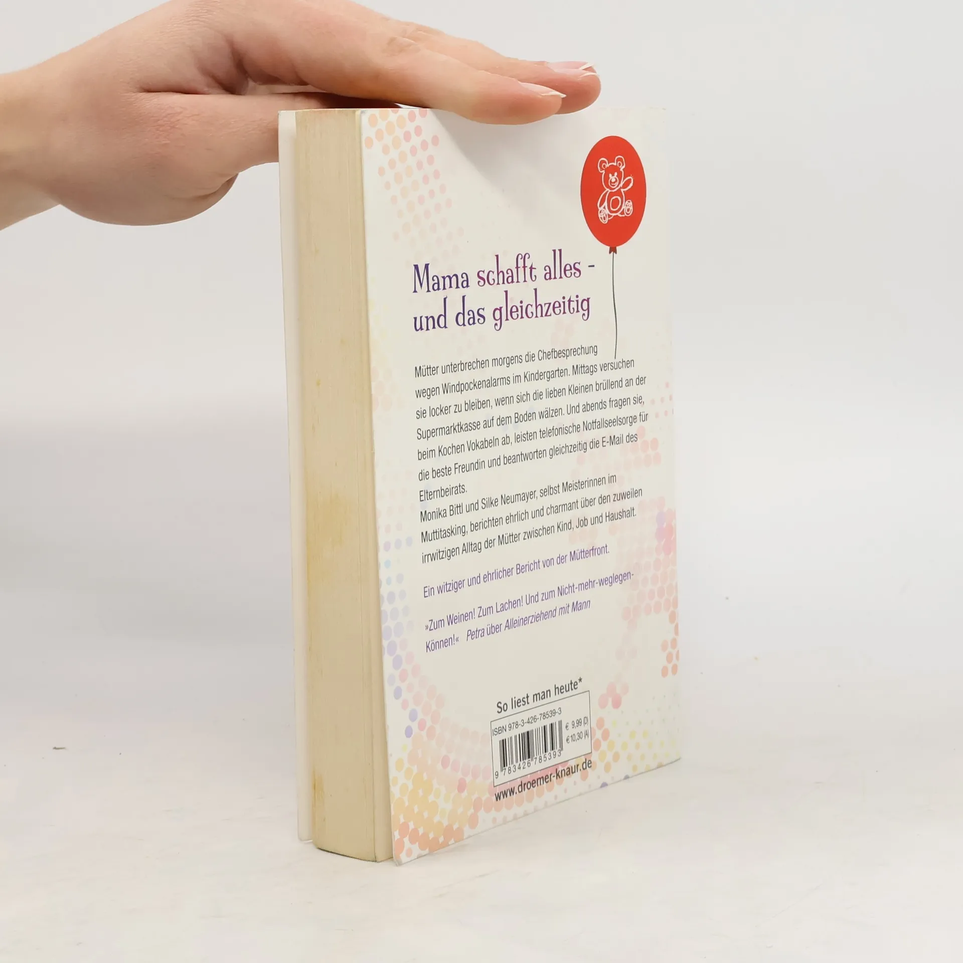 Mütter befinden sich täglich im Sturzflug von den hohen Idealen der perfekten Familie zu den schnöden Dramen des Alltags. Sie unterbrechen morgens eine Chefbesprechung wegen Windpockenalarm aus dem Kindergarten. Mittags versuchen sie an der Supermarktkasse locker zu bleiben, wenn sich die lieben Kleinen brüllend vor der Quengelware auf dem Boden wälzen. Und sie fragen abends beim Kochen Vokabeln ab, leisten telefonische Notfallseelsorge für die beste Freundin und beantworten gleichzeitig noch die Mail des Elternbeirats. Monika Bittl und Silke Neumayer, selbst Meisterinnen im Muttitasking, berichten ehrlich und charmant über den zuweilen irrwitzigen Alltag der Mütter zwischen Kind, Job und Haushalt.