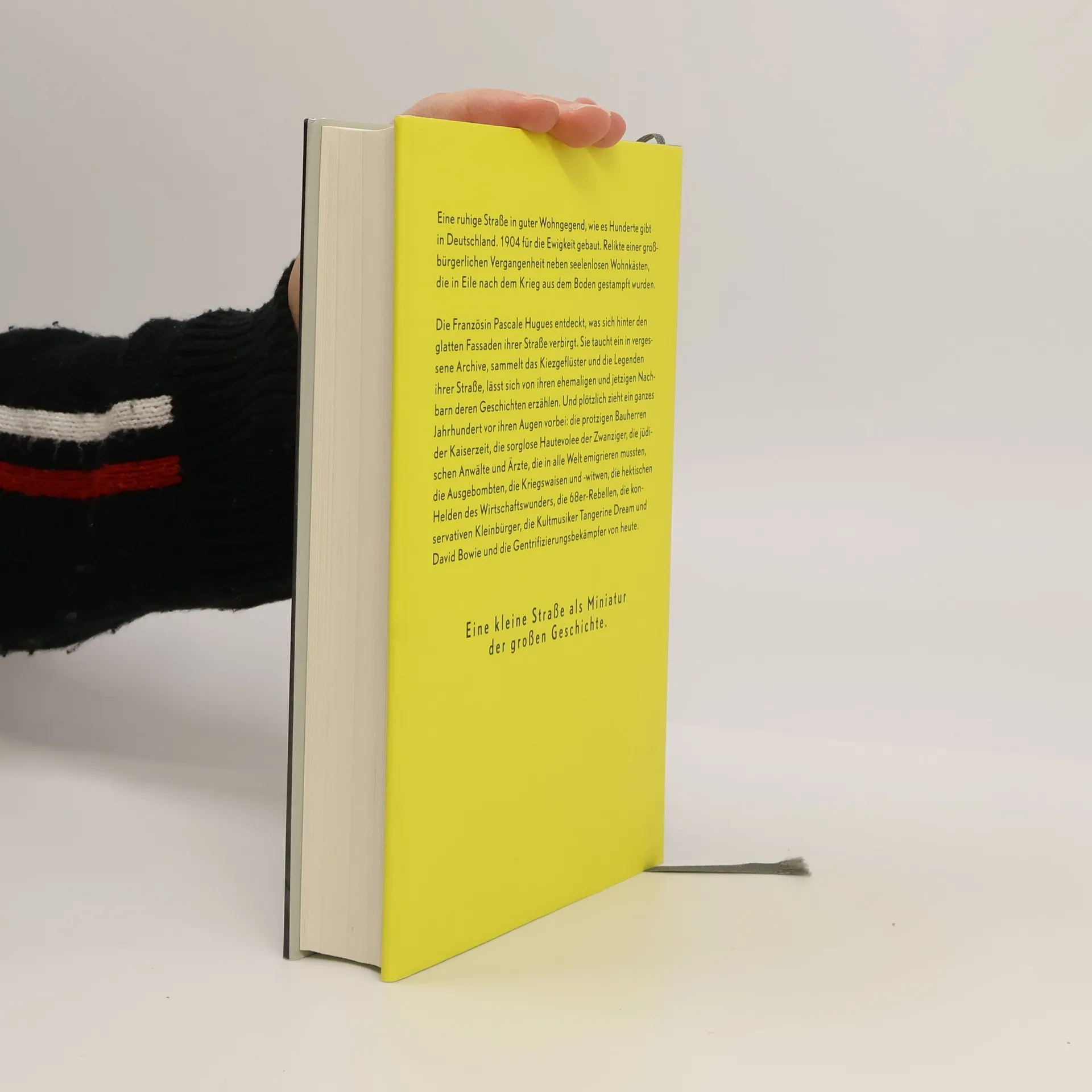 Eine ruhige Straße in guter Wohngegend, wie es Hunderte gibt in Deutschland. 1904 für die Ewigkeit gebaut. Relikte einer großbürgerlichen Vergangenheit neben seelenlosen Wohnkästen, die in Eile nach dem letzten Krieg aus dem Boden gestampft wurden. Die Französin Pascale Hugues entdeckt, was sich hinter den glatten Fassaden ihrer Straße verbirgt. Sie tauch ein in vergessene Archive, sammelt das Kiezgeflüster und die Legenden ihrer Straße, lässt sich von ihren ehemaligen und jetzigen Nachbarn deren Geschichten erzählen. Und plötzlich zieht ein ganzes Jahrhundert vor ihren Augen vorbei: die protzigen Bauherren der Kaiserzeit, die sorglose Hautevolee der Zwanziger, die jüdischen Anwälte und Ärzte, die in alle Welt emigrieren mussten, die Ausgebombten, die Kriegswaisen und -witwen, die hektischen Helden des Wirtschaftswunders, die 68er-Rebellen, die konservativen Kleinbürger, die Kultmusiker Tangerine Dream und David Bowie und die Gentrifizierungsbekämpfer von heute. Eine kleine Straße als Miniatur der großen Geschichte.