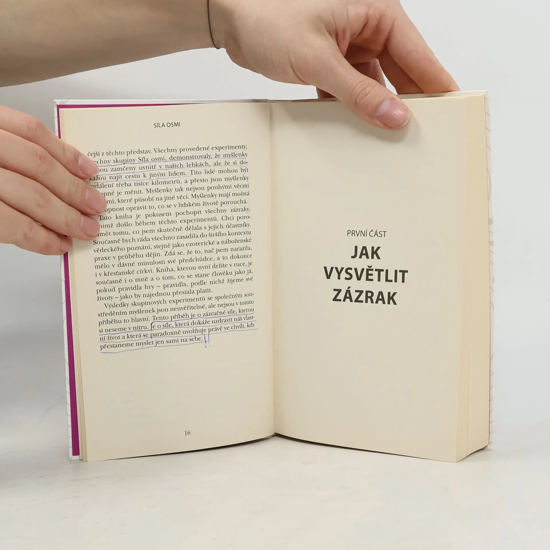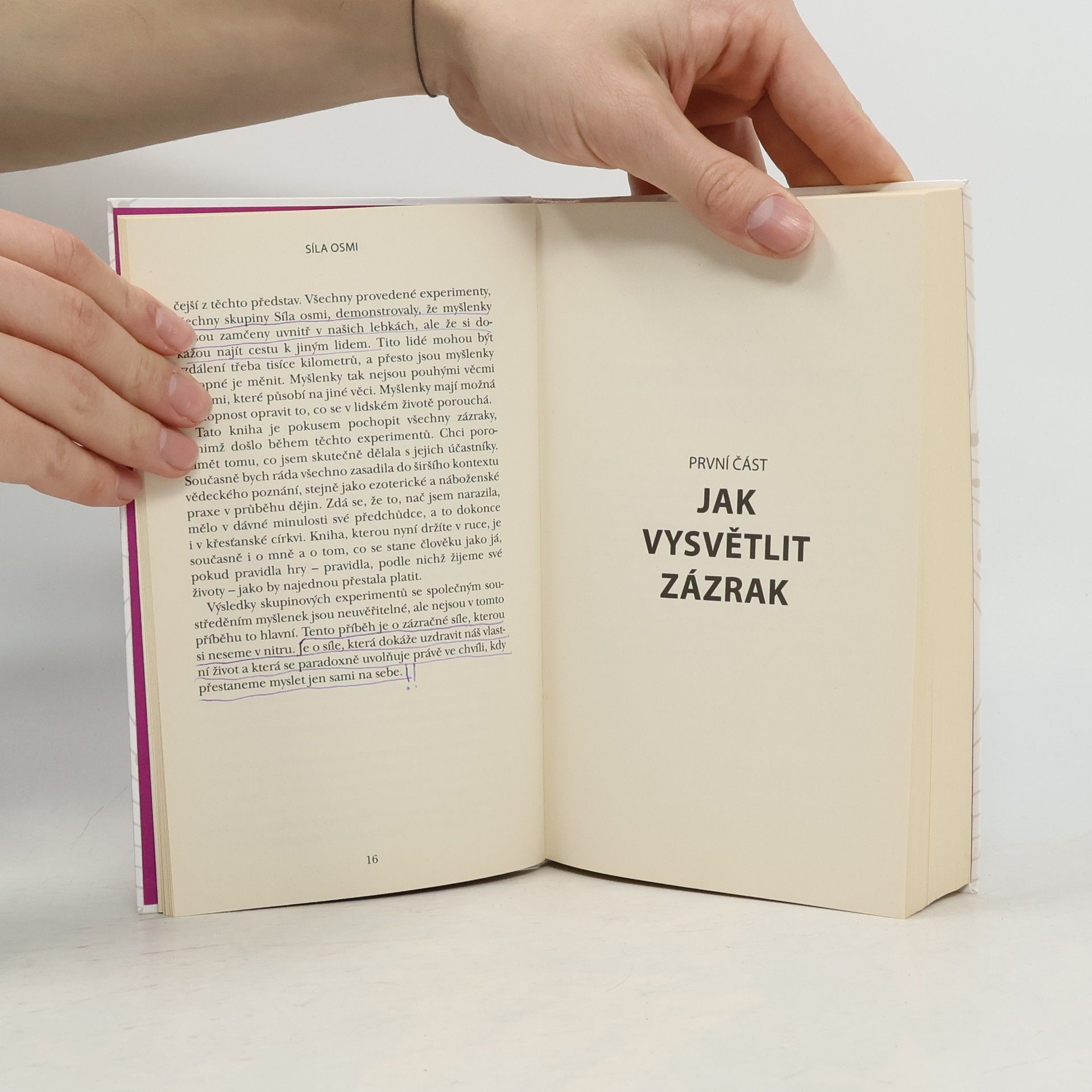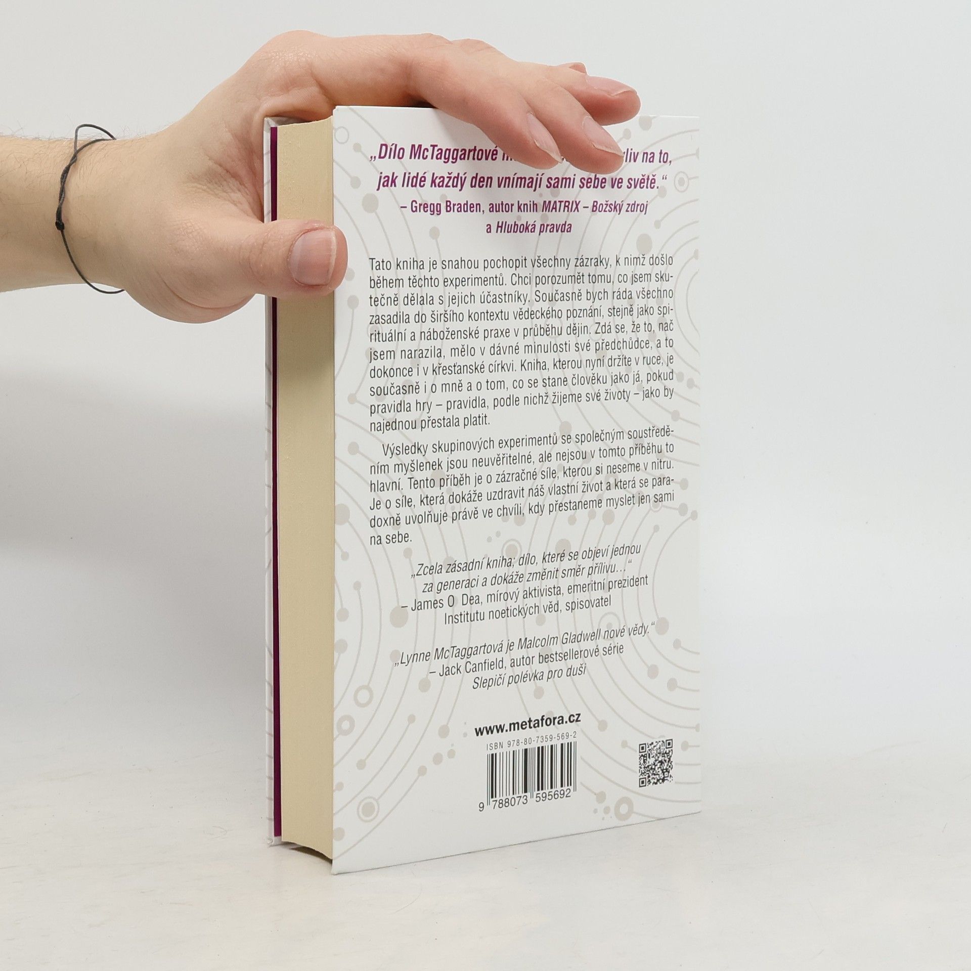 TRANSFORMAČNÍ SÍLA KOLEKTIVNÍHO VĚDOMÍ Jak využít zázračnou energii skupinky lidí k uzdravení jednotlivců i celého světa Objevte svou mimořádnou schopnost spojit sílu vlastní pozitivní myšlenky se silou druhých a začněte uvnitř i kolem sebe působit neuvěřitelné změny k lepšímu… Lynne McTaggartová ve své knize předkládá převratné, ohromující poznatky o zázračné síle myšlenky, sdílené skupinou, a o jejím bumerangovém efektu. Co vysíláme do vesmíru, to se k nám vrací v zesílené formě. Přestože je síla úmyslu – energie pozitivní myšlenky – obecně vnímána jako zdroj změn, nesmírná síla myšlenky sdílené skupinou dosud prozkoumána nebyla. V Síle osmi přináší Lynne McTaggartová, odbornice na spirituální vědu, pozoruhodné výsledky deset let trvajících experimentů zaměřených na to, jak může myšlenka sdílená osmi lidmi uzdravovat a měnit celý svět k lepšímu. Na základě nejnovějších vědeckých poznatků z oblasti výzkumu mozku, experimentů Gregga Bradena (autora knihy MATRIX, Božský zdroj) i výsledků vlastního univerzitního bádání zde představuje solidní důkazy o tom, že existuje síla kolektivního vědomí i jak funguje. S pomocí této poutavé a jednoduše srozumitelné knihy se můžete naučit uvolnit energii ukrytou ve vašem nitru a používat ji k tomu nejlepšímu účelu – k uzdravení sebe i světa kolem. „Zcela zásadní kniha; dílo, které se objeví jednou za generaci a dokáže změnit směr přílivu…“