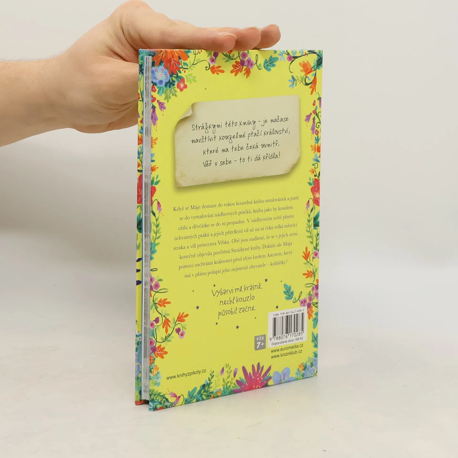 Když se Máje dostane do rukou kouzelná kniha omalovánek a pustí se do vymalování nádherných ptáčků, kniha jako by kouzlem ožila a děvčátko se do ní propadne. V nádherném světě plném úchvatných ptáků a jejich přítelkyň víl už na ni čeká velká mluvící straka a vílí princezna Vrbička. Obě jsou nadšené, že se v jejich zemi konečně objevila pověstná Strážkyně knihy. Dokáže ale Mája pomoci zachránit království před zlým lordem Astorem, který má v plánu polapit jeho nejmenší obyvatele – kolibříky? A bude mít děvčátko dost odvahy na jejich záchranu? Kniha je určena dětem od 7 let a doprovází ji krásné ilustrace Rosie Butcherové.