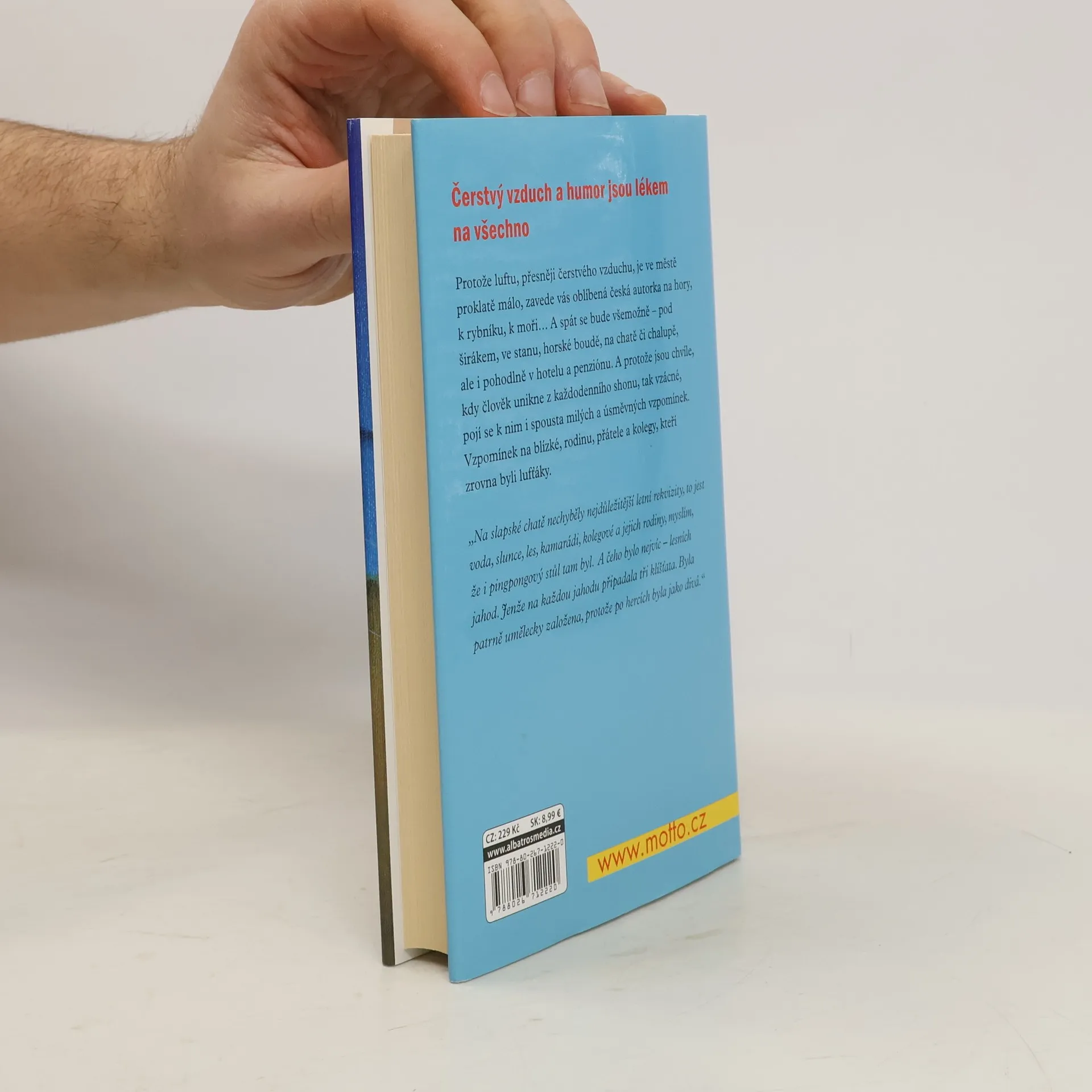 Protože luftu, přesněji čerstvého vzduchu, je ve městě proklatě málo, zavede vás oblíbená česká spisovatelka na hory, k rybníku, k moři… A spát se bude všemožně – pod širákem, ve stanu, horské boudě, na chatě či chalupě, ale i pohodlně v hotelu a penziónu. A protože jsou chvíle, kdy člověk unikne z každodenního shonu, tak vzácné, pojí se k nim i spousta milých a úsměvných vzpomínek. Vzpomínek na blízké, rodinu, přátele a kolegy, kteří zrovna byli lufťáky.