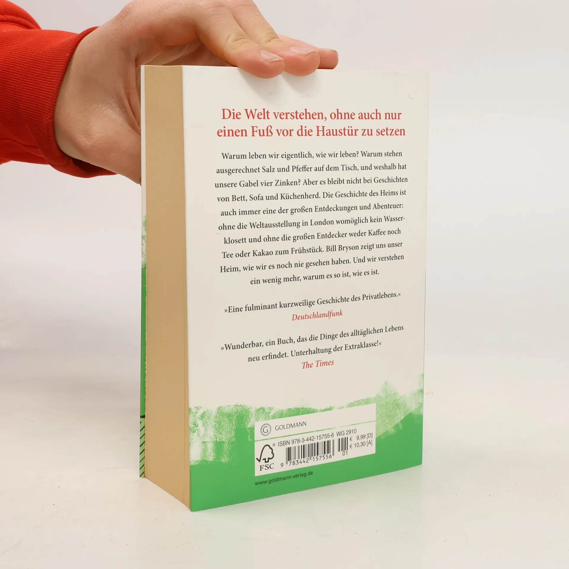 Die Welt verstehen, ohne auch nur einen Fuß vor die Haustür zu setzen. Was bleibt nach der „Geschichte von fast allem“ eigentlich noch zu schreiben? Die Geschichte von fast allem anderen, natürlich. Bill Bryson hat sich daher in seinen vier Wänden umgesehen und sich gefragt: Warum leben wir eigentlich, wie wir leben? Warum stehen ausgerechnet Salz und Pfeffer auf dem Tisch, und weshalb hat unsere Gabel vier Zinken? Aber es bleibt nicht bei Geschichten von Bett, Sofa und Küchenherd. Die Geschichte des Heims ist auch immer eine der großen Entdeckungen und Abenteuer: ohne die Weltausstellung in London gäbe es womöglich kein Wasserklosett und ohne die großen Entdecker weder Kaffee noch Tee oder Kakao zum Frühstück. Bill Bryson zeigt uns unser Heim, wie wir es noch nie gesehen haben. Und wir verstehen ein wenig mehr, warum es so ist, wie es ist.