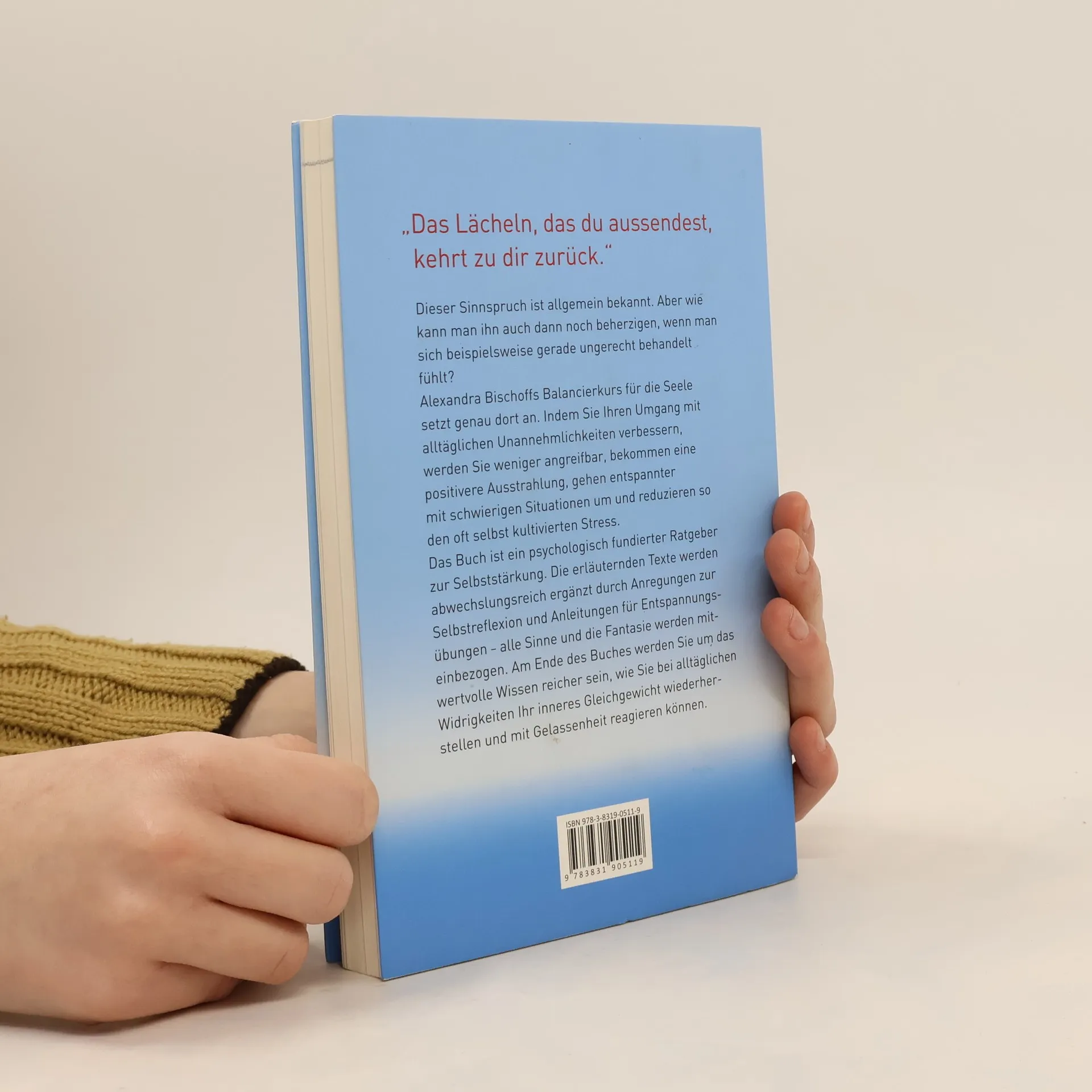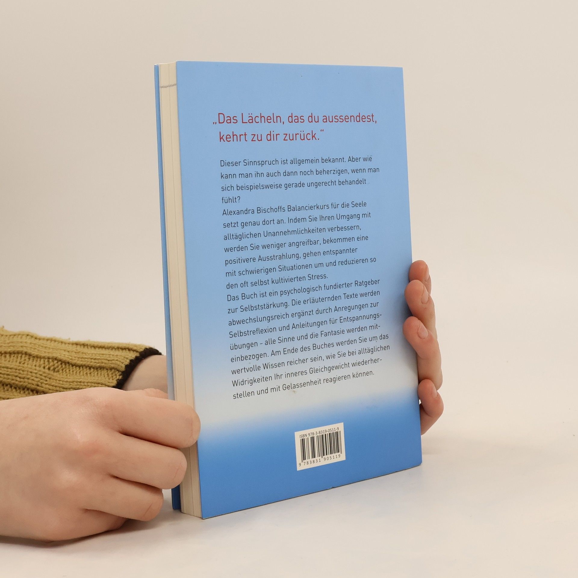 Alexandra Bischoff – „Ich wünsche mir Gelassenheit. Ein Balancierkurs für die Seele“ „Das Lächeln, das du aussendest, kehrt zu dir zurück.“ Dieser Sinnspruch ist allgemein bekannt. Aber wie kann man ihn auch dann noch beherzigen, wenn man sich beispielsweise gerade ungerecht behandelt fühlt? Alexandra Bischoffs Balancierkurs für die Seele setzt genau dort an. Indem wir unseren Umgang mit alltäglichen Unannehmlichkeiten verbessern, werden wir weniger angreifbar, bekommen eine positivere Ausstrahlung, gehen entspannter mit schwierigen Situationen um und reduzieren so den oft selbst kultivierten Stress. Es gilt, sich auf der Wippe des Lebens immer wieder neu ins Gleichgewicht zu bringen, nicht steif in der Mitte zu stehen, sondern flexibel äußere Impulse auszugleichen. Das Buch ist ein alltagsorientierter, psychologisch fundierter Ratgeber zur Selbststärkung. Die erläuternden Texte werden abwechslungsreich ergänzt durch Anregungen zur Selbstreflexion und Anleitungen für Entspannungsübungen. Am Ende des Buches werden Sie um das wertvolle Wissen reicher sein, wie man trotz alltäglicher Widrigkeiten sein inneres Gleichgewicht wiederherstellen kann.
