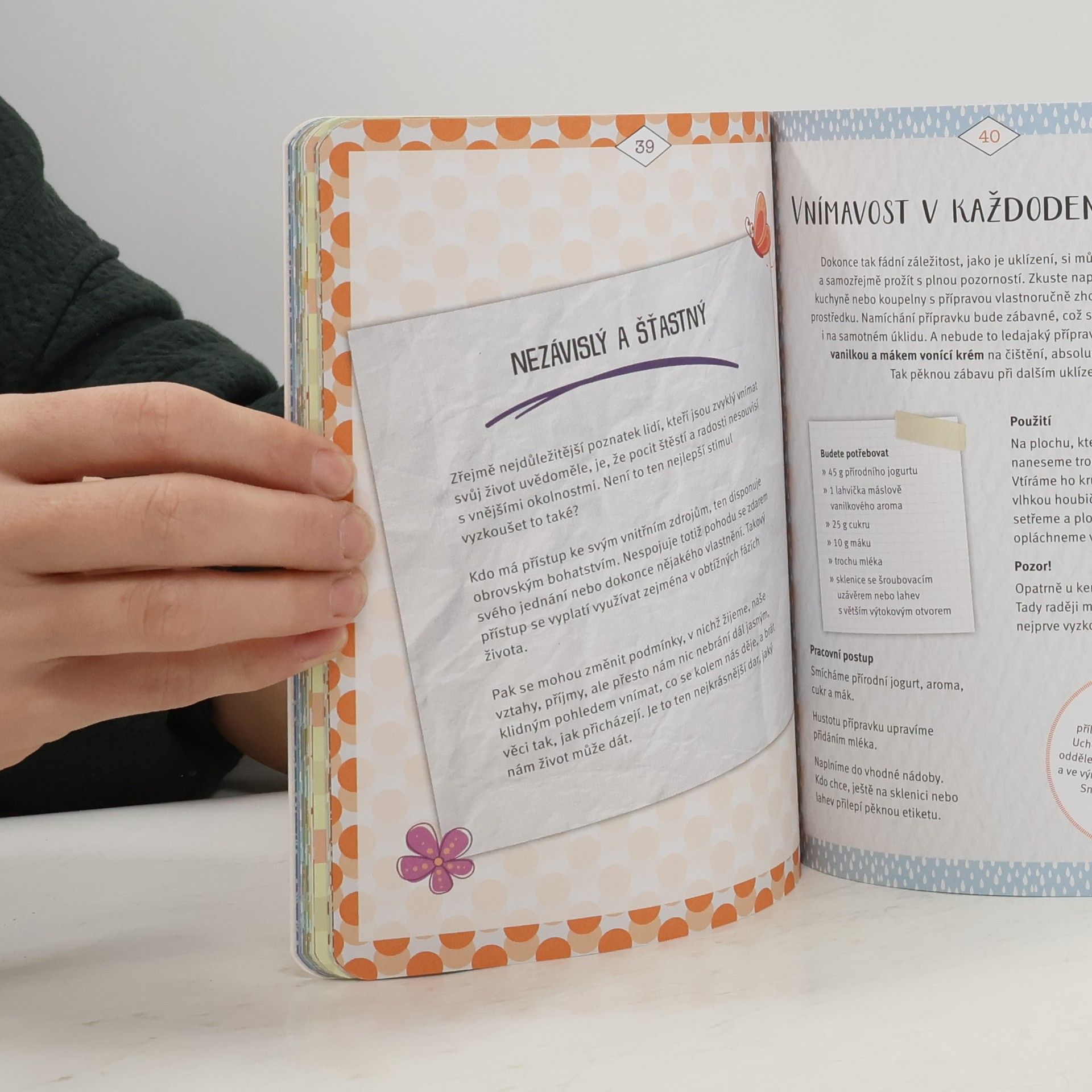 Přejete si šťastný a klidný život? Stejně jako vy má toto přání většina lidí, ale málokdo ví, jak si jej splnit. Klíčem je bdělá pozornost a tato kniha vám nabídne rovnou 100 malých cest k pozornějšímu životu. Na originálně navržených stránkách najdete cvičení, malé meditace, jógu, krásné omalovánky, speciální domácí projekty a nápady na wellness, které vám umožní objevit šťastné momenty v každodenním životě.