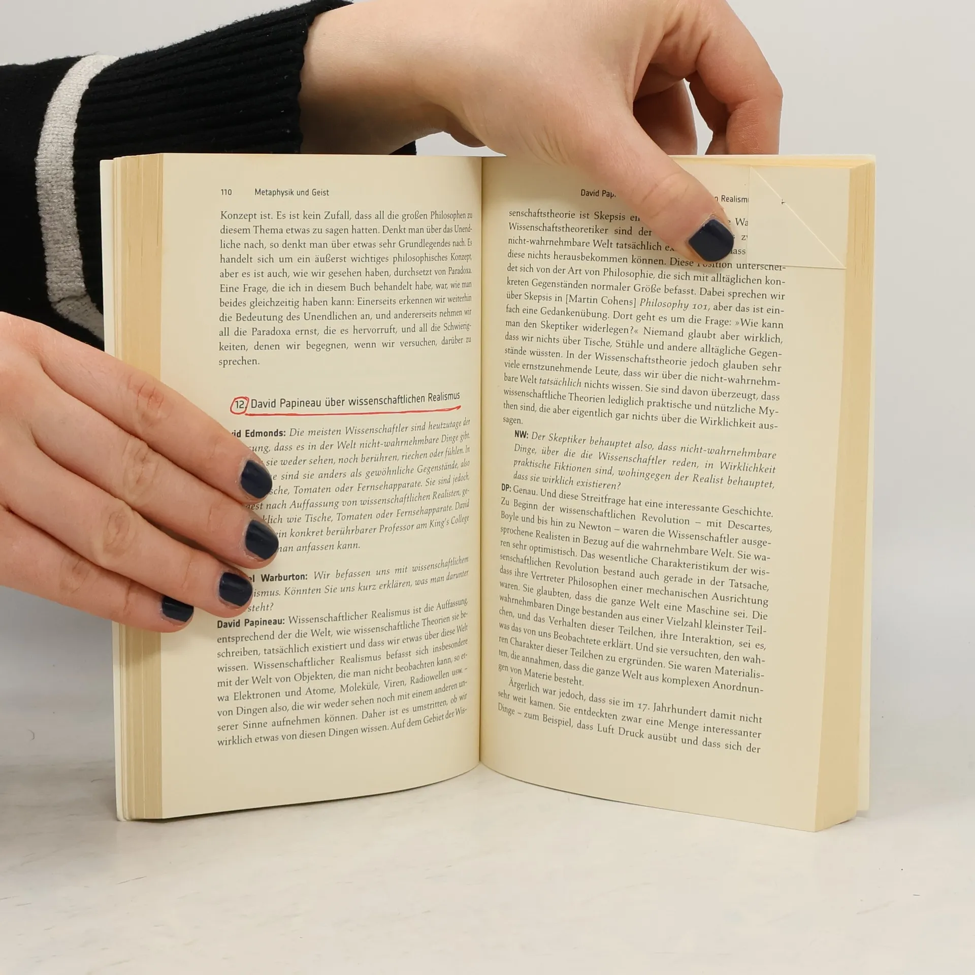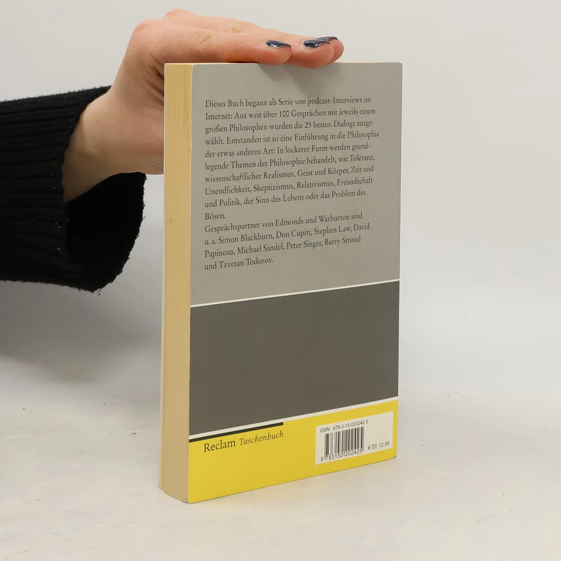 Dieses Buch begann als Serie von podcast-Interviews im Internet: Aus weit über hundert Gesprächen zu einem bestimmten Thema mit jeweils einem großen Philosophen wurden die fünfundzwanzig besten Dialoge ausgewählt - entstanden ist so eine Einführung in die Philosophie der etwas anderen Art. In lockerer Form werden grundlegende Themen der Philosophie behandelt: Toleranz, wissenschaftlicher Realismus, Geist und Körper, Zeit und Unendlichkeit, Skeptizismus, Relativismus, Freundschaft und Politik, der Sinn des Lebens, das Problem des Bösen. Gesprächspartner von Edmonds und Warburton sind u. a. Simon Blackburn, Don Cupitt, Stephen Law, David Papineau, Michael Sandel, Peter Singer, Barry Stroud oder Tzvetan Todorov.