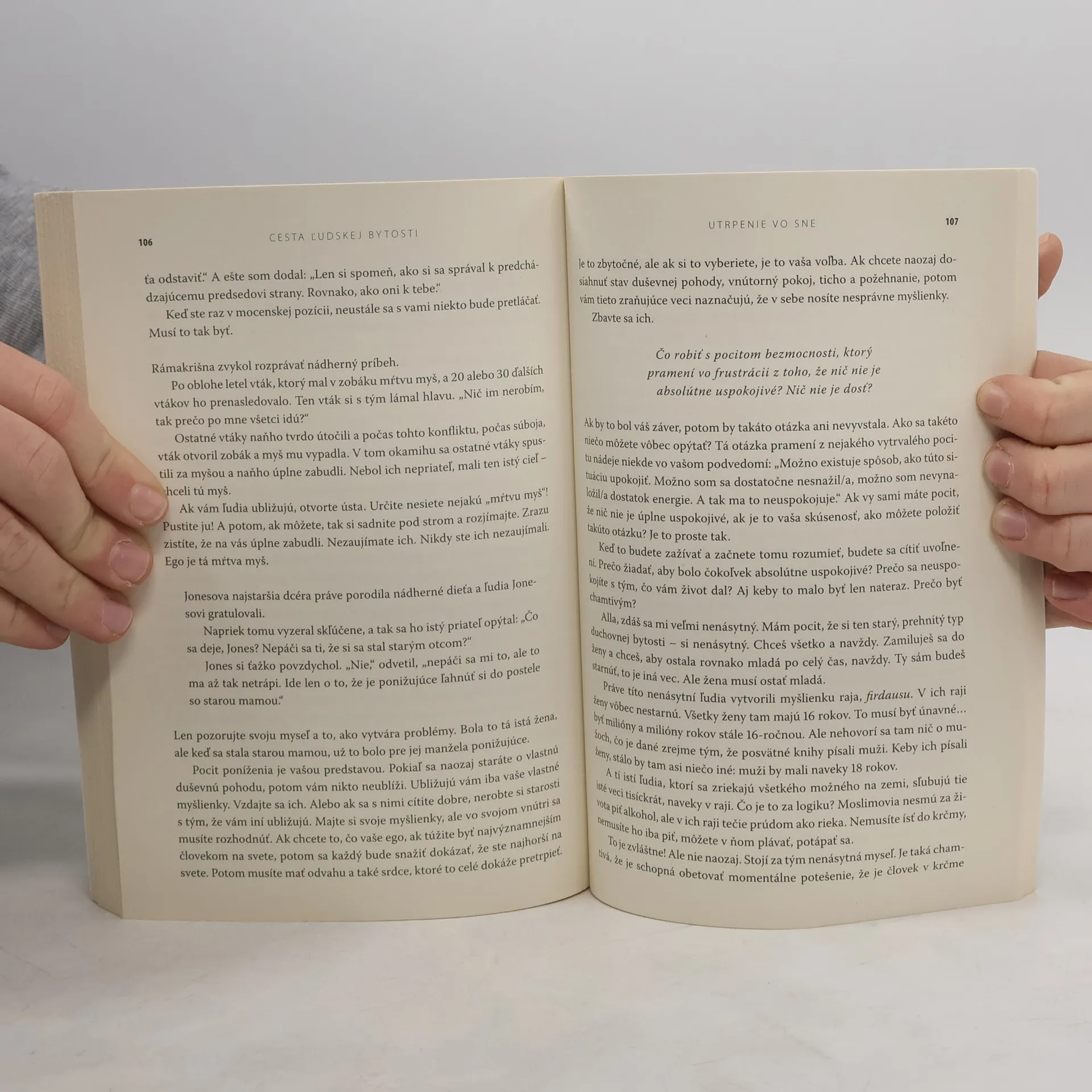Je možné objaviť šťastie v obyčajnom živote? Prečo človek často pociťuje hlbokú nespokojnosť s vlastným životom? Ako sa dá zistiť, kým som a ako prebudiť vlastný prirodzený potenciál? Ako vychovávať deti tak, aby sme nezasahovali do ich prirodzeného potenciálu? Ako vnímať smrť? Človek je most medzi zvieracím a božským a práve to, že si tento aspekt uvedomujeme, z nás robí ľudí. Zároveň to však spôsobuje, že sme nespokojní a plní protikladov, často stojaci na rozhraní medzi štedrosťou a sebectvom, láskou a nenávisťou, silou a krehkosťou, nádejou a zúfalstvom, ambíciami a pokorou. V knihe Cesta ľudskoskej bytosti sa Osho zaoberá otázkou, ako je možné tieto zdanlivé protiklady prijať a dokonca uvítať namiesto toho, aby sme sa neustále snažili zvoliť si len jeden z nich, pretože protichodné pocity a vlastnosti sú nástrojom našej transformácie a rastu.