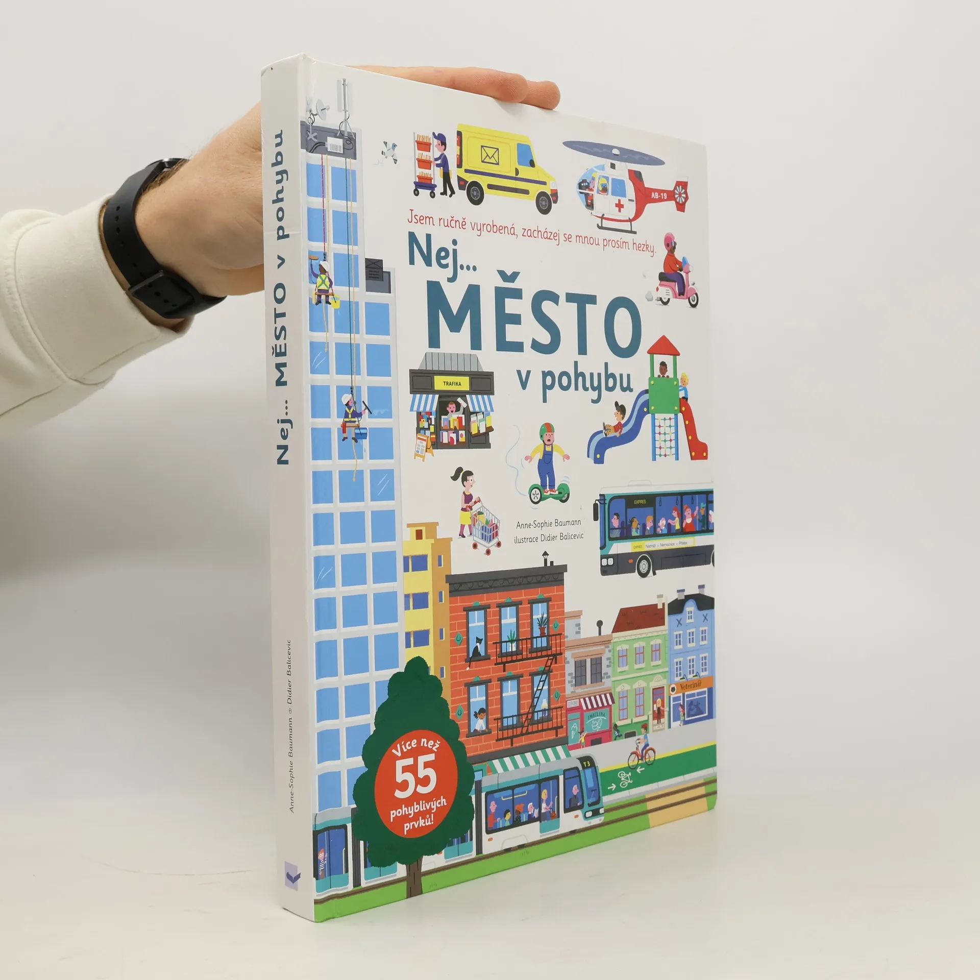 Vítej ve městě! Díky odklápěcím okénkům, výsuvným a posuvným obrázkům, otáčecím kolečkům a dalším pohyblivým prvkům celá metropole ožije! Prozkoumej město do nejmenších detailů. Pusť se do objevování všeho toho městského ruchu a shonu. Projeď se hromadnou dopravou, navštiv obchodní dům a zavítej do kanceláří v prosklených budovách. Tak jako v opravdovém velkoměstě je toho spousta k vidění i v této nej… knize, která obsahuje více než 55 pohyblivých prvků. Pomoz sanitce dostat se k místu nehody, projeď se výtahem nahoru a dolů a prozkoumej muzeum. V této knize je vše, co chceš ve městě poznat. Nabízí ti dlouhé hodiny hraní a objevování! Kniha je ručně vyrobená; aby pohyblivé prvky dlouho vydržely, vyžaduje jemnější zacházení.