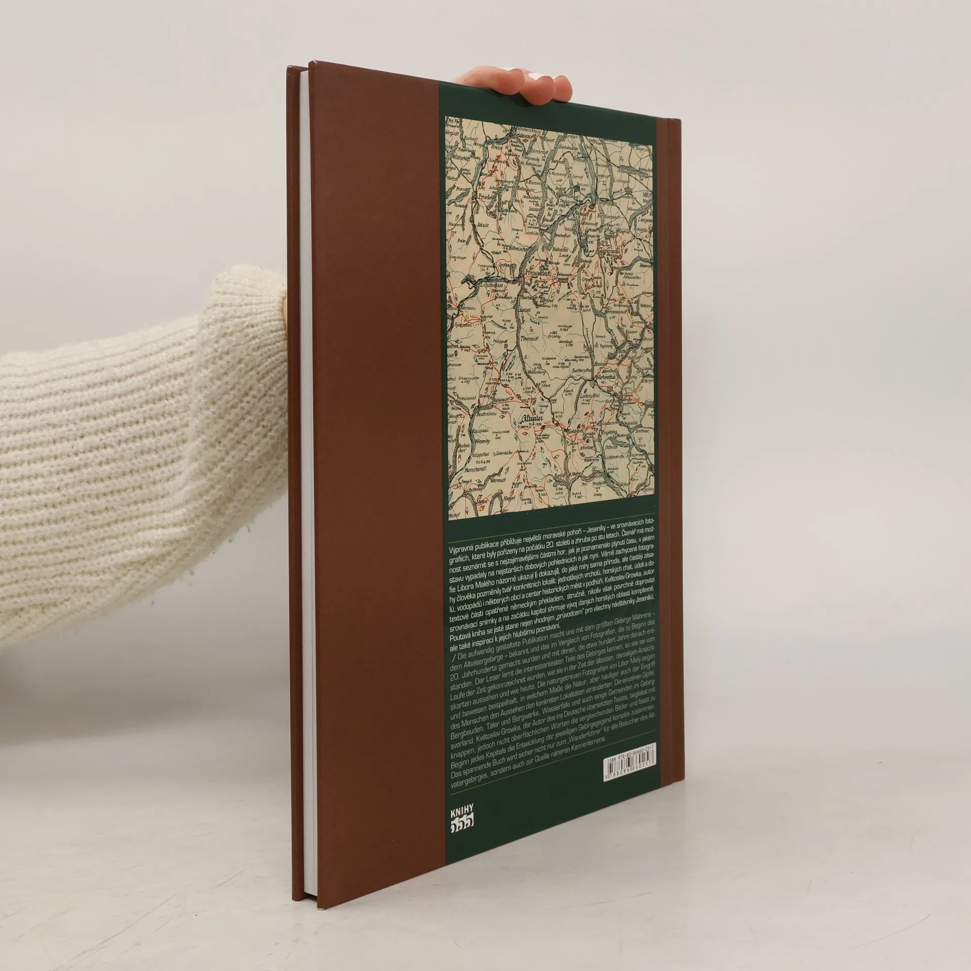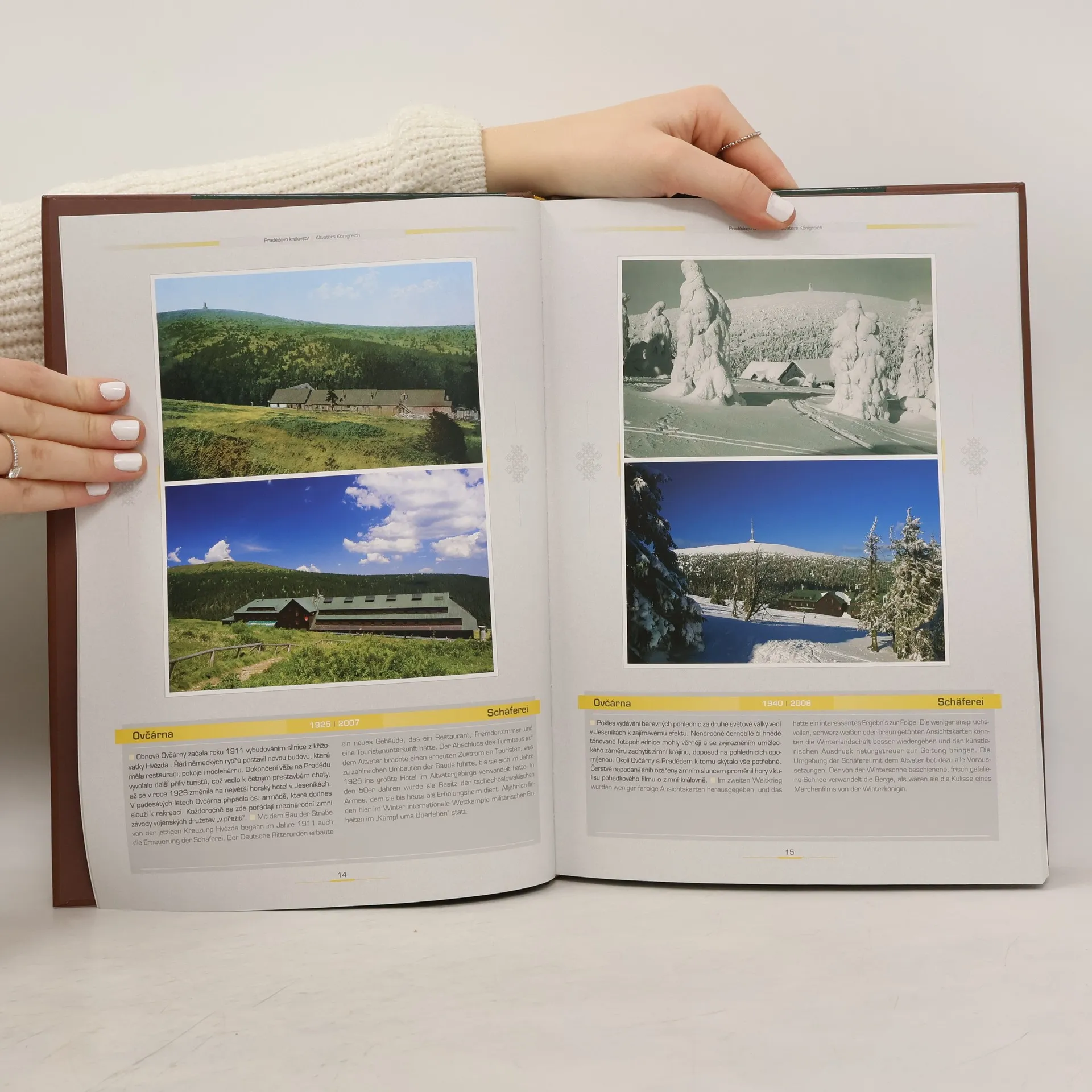 Výpravná publikace přibližuje největší moravské pohoří – Jeseníky – ve srovnávacích fotografiích, které byly pořízeny na počátku 20. století a zhruba po stu letech. Čtenář má možnost seznámit se s nejzajímavějšími částmi hor, jak je poznamenalo plynutí času, v jakém stavu vypadaly na nejstarších dobových pohlednicích let a jak nyní. Věrně zachycené fotografie Libora Malého názorně ukazují (i dokazují), do jaké míry sama příroda, ale častěji zásahy člověka pozměnily tvář konkrétních lokalit: jednotlivých vrcholů, horských chat, údolí a dolů, vodopádů i některých obcí a center historických měst v podhůří. Květoslav Growka, autor textové části opatřené německým překladem, stručně, nikoliv však povrchně doprovází srovnávací snímky a na začátku kapitol shrnuje vývoj daných horských oblastí komplexně. Poutavá kniha se jistě stane nejen vhodným „průvodcem“ pro všechny návštěvníky Jeseníků, ale také inspirací k jejich hlubšímu poznávání.