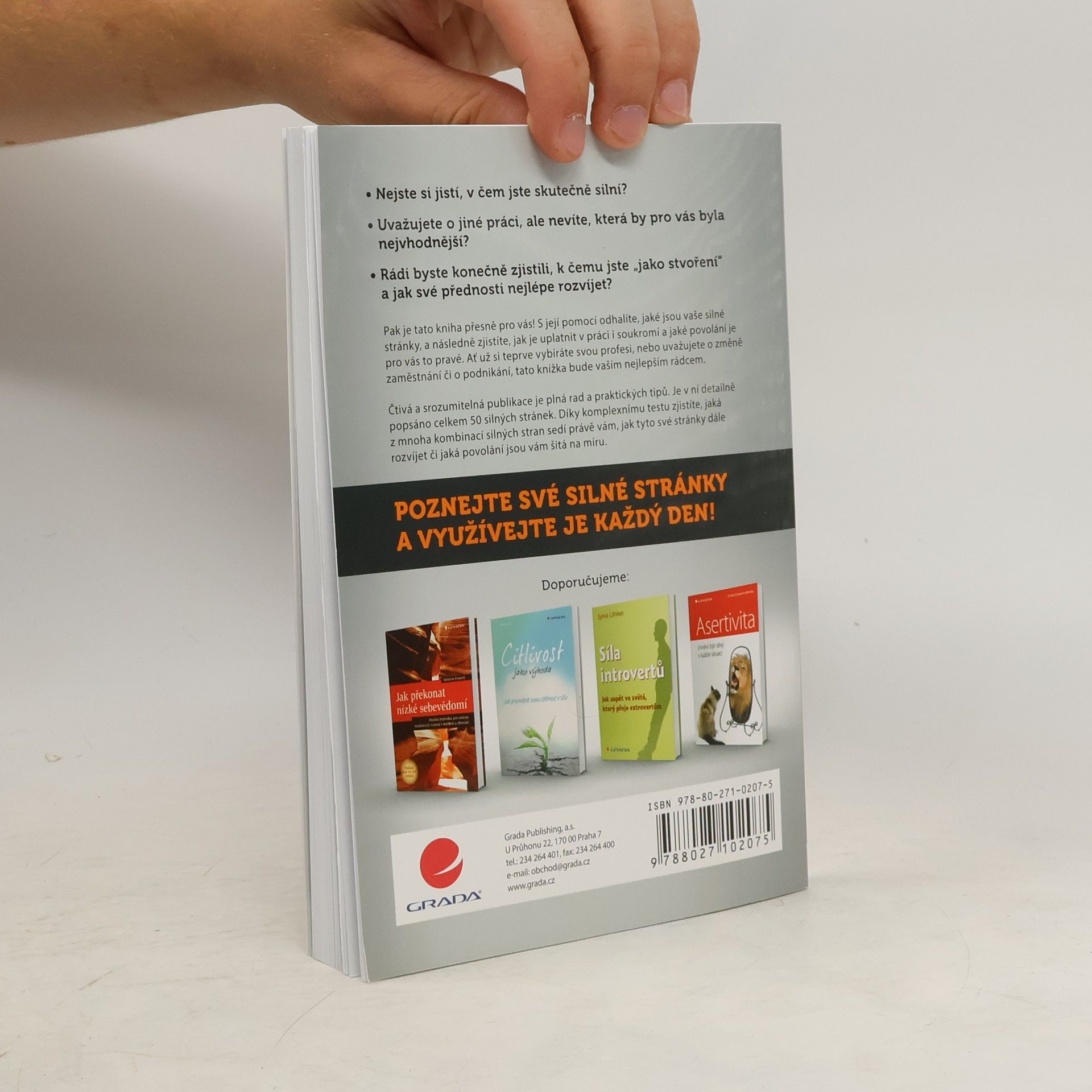 - Nejste si jistí, v čem jste skutečně silní? - Uvažujete o jiné práci, ale nevíte, která by pro vás byla nejvhodnější? - Rádi byste konečně zjistili, k čemu jste „jako stvoření“ a jak své přednosti nejlépe rozvíjet? Pak je tato kniha přesně pro vás! S její pomocí odhalíte, jaké jsou vaše silné stránky, a následně zjistíte, jak je uplatnit v práci i soukromí a jaké povolání je pro vás to pravé. Ať už si teprve vybíráte svou profesi, nebo uvažujete o změně zaměstnání či o podnikání, tato knížka bude vaším nejlepším rádcem. Čtivá a srozumitelná publikace je plná rad a praktických tipů. Je v ní detailně popsáno celkem 50 silných stránek. Díky komplexnímu testu zjistíte, jaká z mnoha kombinací silných stran sedí právě vám, jak tyto své stránky dále rozvíjet či jaká povolání jsou vám šitá na míru. Poznejte své silné stránky a využívejte je každý den!