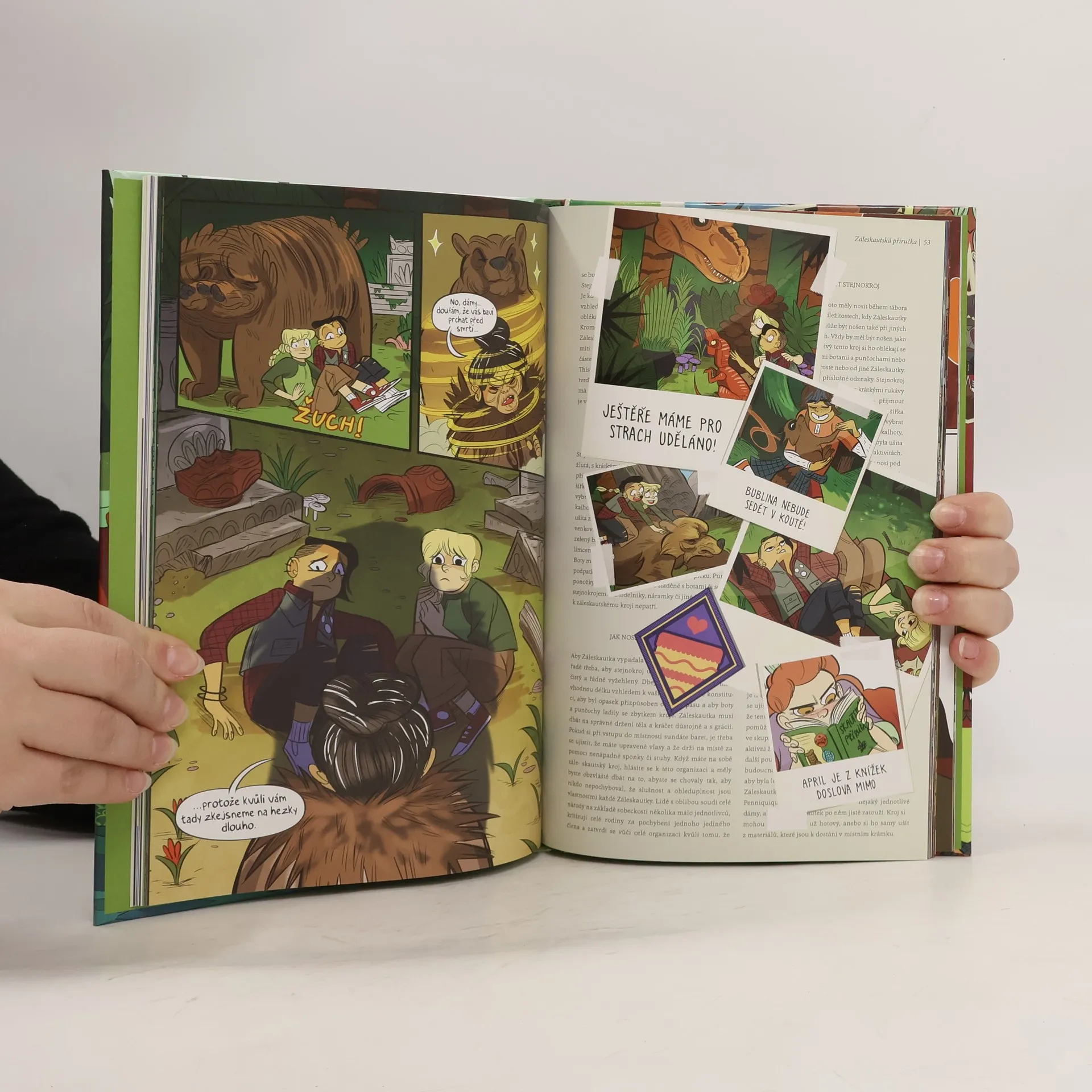 Po dlouhé době je v táboře klid, který chtějí Mal a Molly využít k randění. Jejich plány ale překazí návrat medvědí ženy a neplánovaná cesta portálem, na jehož druhé straně čekají… dinosauři. Proč do všeho musejí strkat nos dinosauři? Mezitím se Jo, April a Ripley věnují sbírání nudných bobříků a činnostem, které v žádném případě nezavání dobrodružnými výpravami ani používáním bojových umění. Jenže zdobení dortů a vystřihování může být pro „tvrďácký dámy“ daleko větší výzva než souboje s magickými bytostmi a tříokými liškami. Záleskautky se právem staly kultem pro moderní čtenářky i čtenáře. Ulítlou formou podporují hodnoty, jako jsou přátelství, tolerance, ochrana přírody a odvaha.