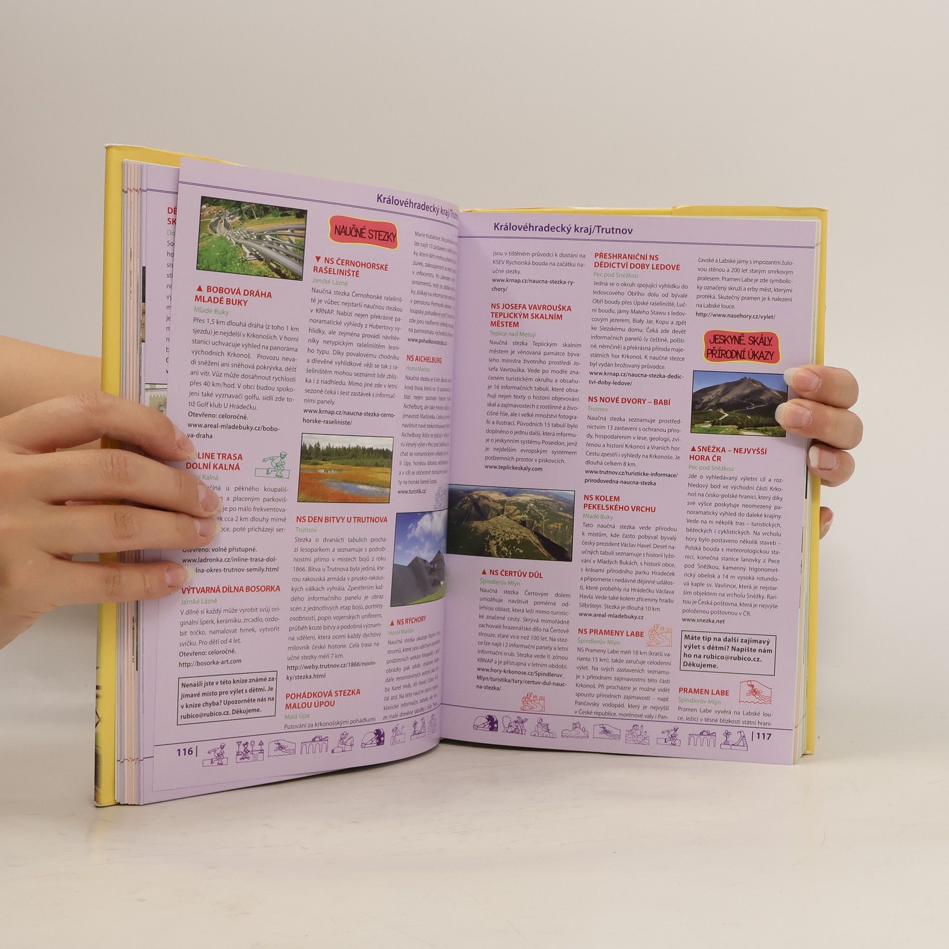 Kniha přináší stručný popis téměř čtyř tisíc míst vhodných pro výlet s dětmi. Zeměpisná a historická místa (rozhledny, jeskyně, jezera, vodopády, naučné stezky, skály, hrady, zámky, zříceniny, technické památky, podzemí, …), umělé atrakce (aquaparky, bazény, bruslení, dinoparky, lanová centra, muzea, hvězdárny, zoologické zahrady a zookoutky, jezdecké farmy, ekofarmy, …), ale také pravidelně se opakující akce (rallye, letecké dny, výročí bitev, …). Místa jsou popsána včetně otevírací doby a odkazu na webové stránky. V knize je jednoduchá orientace - jednotlivé odkazy jsou seřazeny podle krajů, okresů a zaměření.