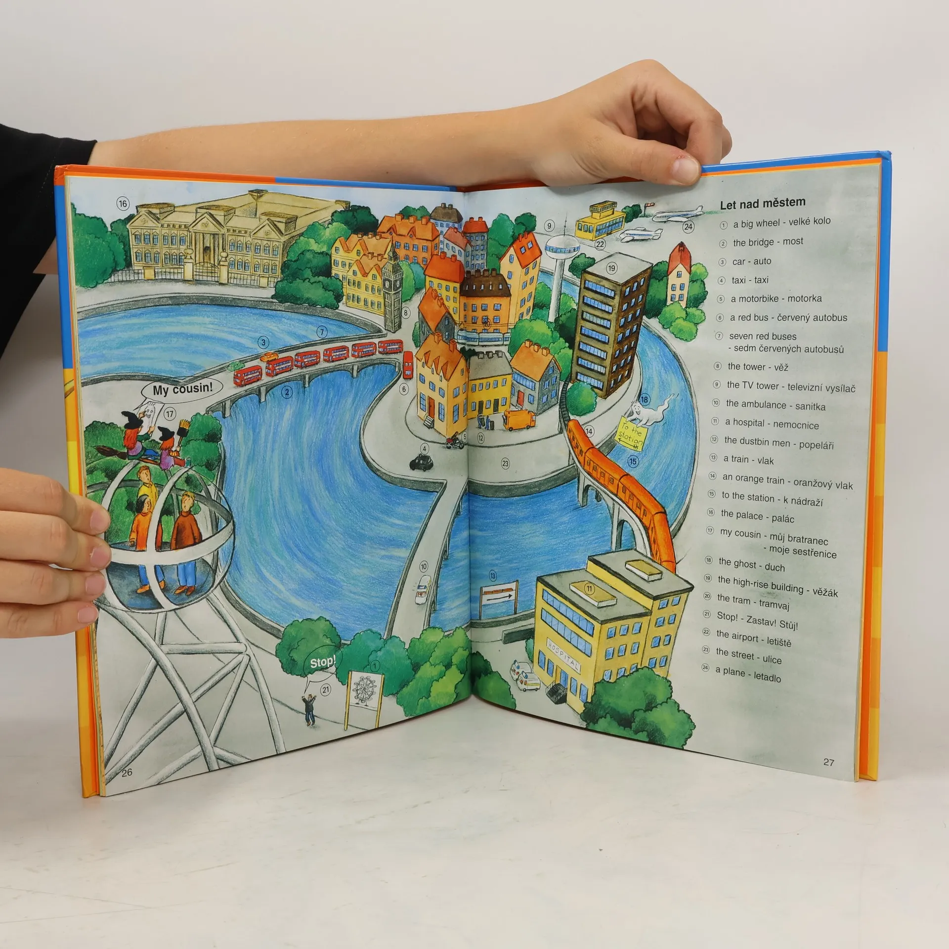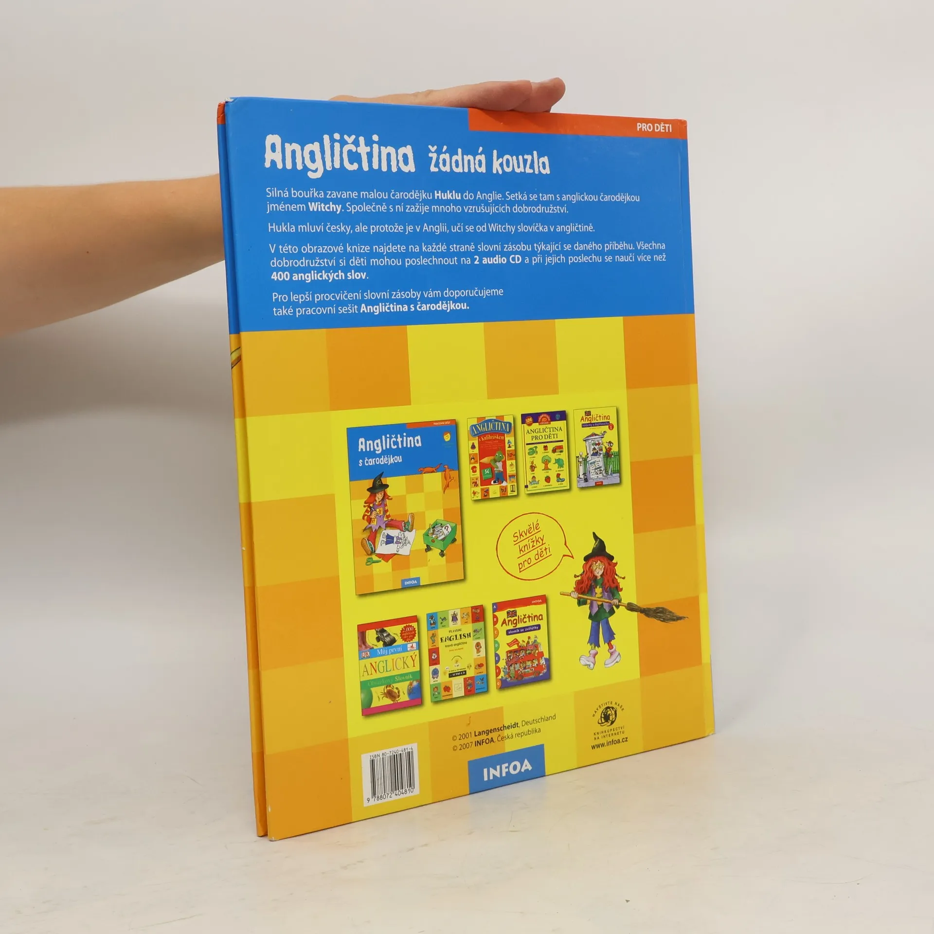 Silná bouřka zavane malou čarodějku Huklu do Anglie. Setká se tam s anglickou čarodějkou jménem Witchy. Společně s ní zažije mnoho vzrušujících dobrodružství. Hukla mluví česky, ale protože je v Anglii, učí se od Witchy slovíčka v angličtině. V této obrazové knize najdete na každé straně slovní zásobu týkající se daného příběhu.