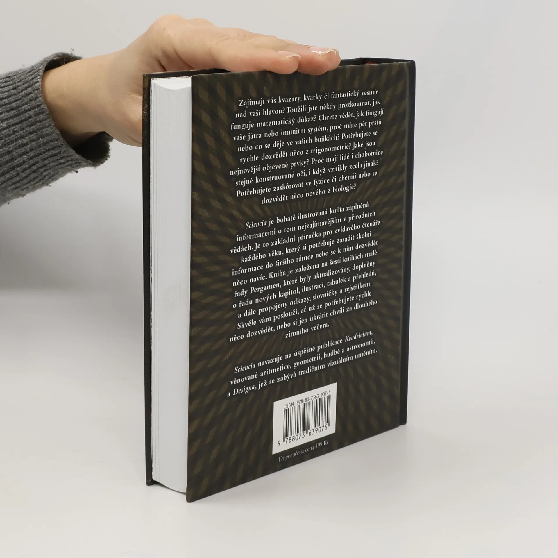 Sciencia je bohatě ilustrovaná kniha zaplněná informacemi o tom nejzajímavějším v přírodních vědách. Je to základní příručka pro zvídavého čtenáře kaž- dého věku. Kniha je založena na šesti knihách řady Pergamen, které byly aktualizovány, doplněny o řadu nových kapitol, ilustrací, tabulek a přehledů, a dále propojeny odkazy, slovníčky a rejstříkem. Skvěle vám poslouží, ať už se potřebujete rychle něco dozvědět, nebo si jen ukrátit dlouhé chvíle v deštivém odpoledni.