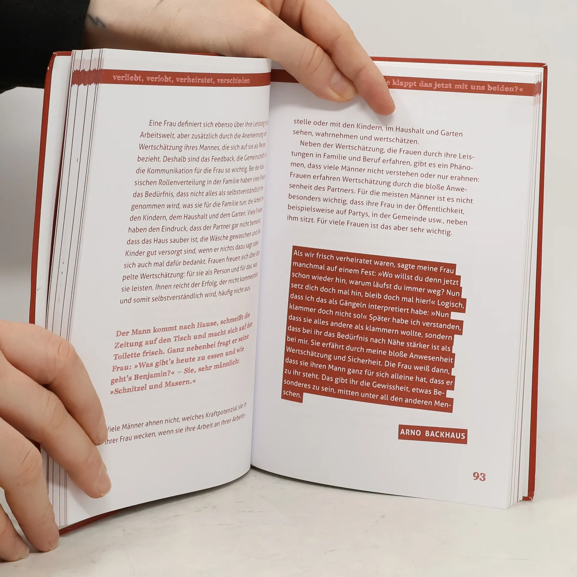 Die Ehe ist keine Neuauflage des 30-jährigen Krieges auf 60 Quadratmetern. Doch Männer und Frauen sind so unterschiedlich, dass aus dem "Verschieden" schnell ein "Geschieden" wird. Hanna und Arno Backhaus machen Mut, die Unterschiedlichkeit von Mann und Frau zu erkennen, zu aktzeptieren und konstruktiv damit umzugehen. Dabei plaudern sie mit viel Humor und Charme aus dem eigenen Ehe-Nähkästchen. Ein absolut männertaugliches Buch, da es das Thema mit einer guten Portion Humor angeht.