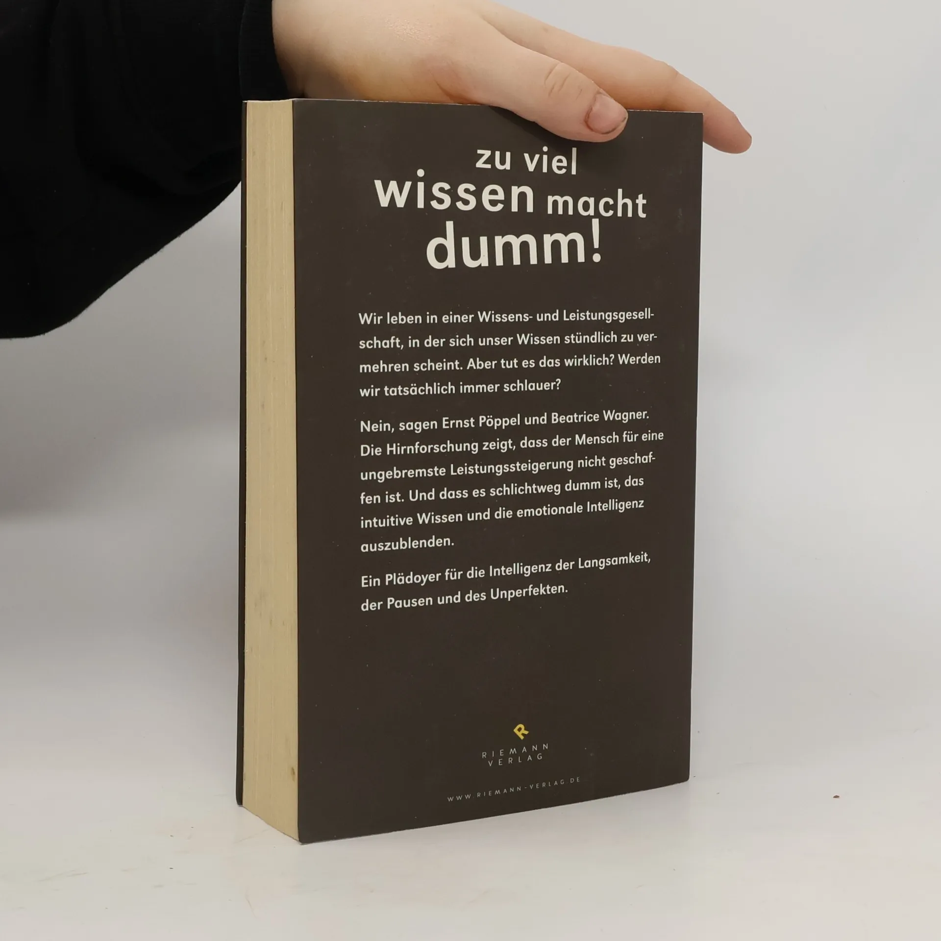 Warum wir heute die einfachsten Dinge nicht mehr wissenIn Zeiten der rasanten Zunahme von Informationen gewinnt der einzelne Mensch nicht etwa an Wissen, sondern verliert es dramatisch. Intuitives Wissen, die Fähigkeit zur Selbstkontrolle, das Wissen um das menschliche Maß, Handlungswissen – was über Generationen überlebenswichtig war, werfen wir zugunsten von „immer mehr“ und „immer schneller“ über Bord. In sieben Exkursen veranschaulichen Ernst Pöppel und Beatrice Wagner, warum wir in so vielen Bereichen so wenig wissen und plädieren für die Intelligenz der Langsamkeit, der Pausen, des Unperfekten. Anhand von prägnanten Beispielen entlarven sie größenwahnsinnige Projekte, aber auch individuelle Dummheiten. Die Dummheit ist nicht zu vermeiden, sie gehört zu unserem biologischen Erbe, ihre Fallen zu kennen, kann aber helfen.