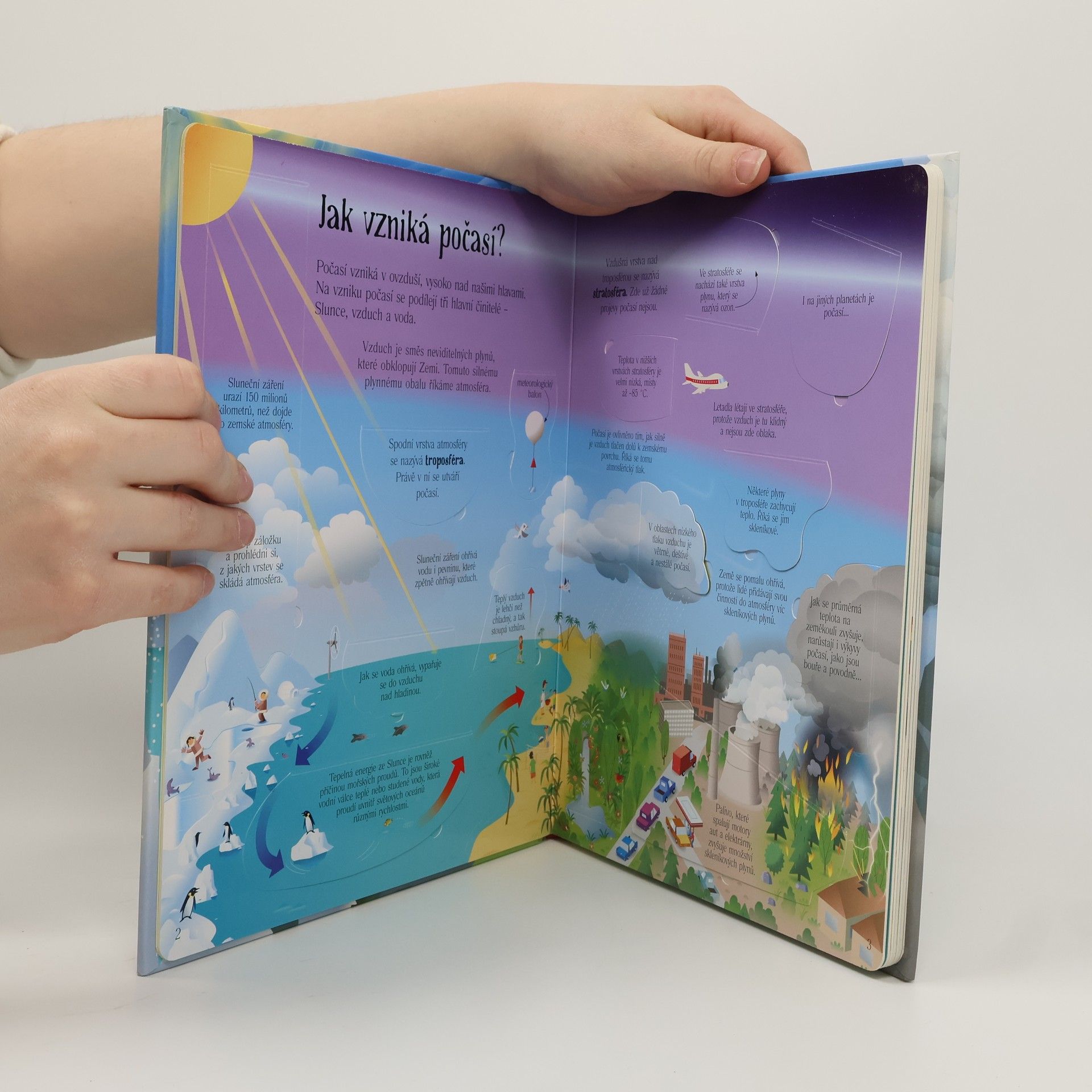 Otevři 100 okének na stránkách této knihy a zjisti, jak vzniká počasí, nahlédni do nitra bouřkového oblaku, podívej se na zrození hurikánu, uč se něco nového! Jak vzniká počasí? Jaké může být? Jaká jsou klimatická pásma na Zemi? Jaký je koloběh vody? Zajímá vás počasí a chcete zjistit, jak to funguje v přírodě? Chcete se dozvědět něco více o působení Slunce, proudění vzduchu, divokých větrech nebo nejmrazivějších oblastech? Tato zajímavá knížka s více než 100 odklápěcích okének vás provede po souši, po moři, oblohou, objevíte s ní, jak vzniká počasí, nahlédnete do nitra bouřkového oblaku, uvidíte zrození hurikánu, navštívíte nejedno místo na zeměkouli a dozvíte se i to, jak by mohlo vypadat počasí v budoucnosti. Otevřete tedy tuto knížku, podívejte se pod okénka a naučte se něco nového!