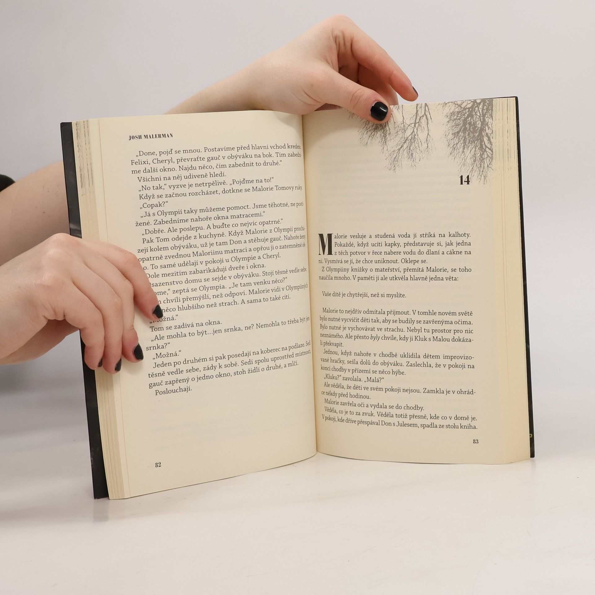 TAM VENKU NĚCO JE… Něco děsivého, co člověk nesmí spatřit. Stačí jediný pohled – a podlehneš smrtelnému násilí. Nikdo netuší, co to je ani odkud to přišlo. Pět let poté, co všechno začalo, zbývá už jen hrstka přeživších – včetně Malorie a jejích dvou malých dětí. Malorie žije v opuštěném domě poblíž řeky a už dlouho sní o tom, že uteče někam, kde snad bude s rodinou v bezpečí. Cesta, která ji čeká, je však hrozivá: překonat pětadvacet kilometrů po proudu řeky v malé loďce – poslepu. Stačí jedno špatné rozhodnutí a všichni zemřou. Něco je sleduje. Je to člověk, zvíře nebo stvůra? Ponořena do tmy, obklopena známými i neznámými zvuky, se Malorie vydává na svou hrůznou odyseu – na cestu, která ji zavede do nespatřeného světa i do minulosti, k přátelům, kteří jí kdysi zachránili život. Josh Malerman ve své úchvatné prvotině prolíná přítomnost s minulostí a nabízí čtenáři hrůzný, zároveň však nesmírně poutavý příběh zborceného světa, který budete hltat do poslední stránky.