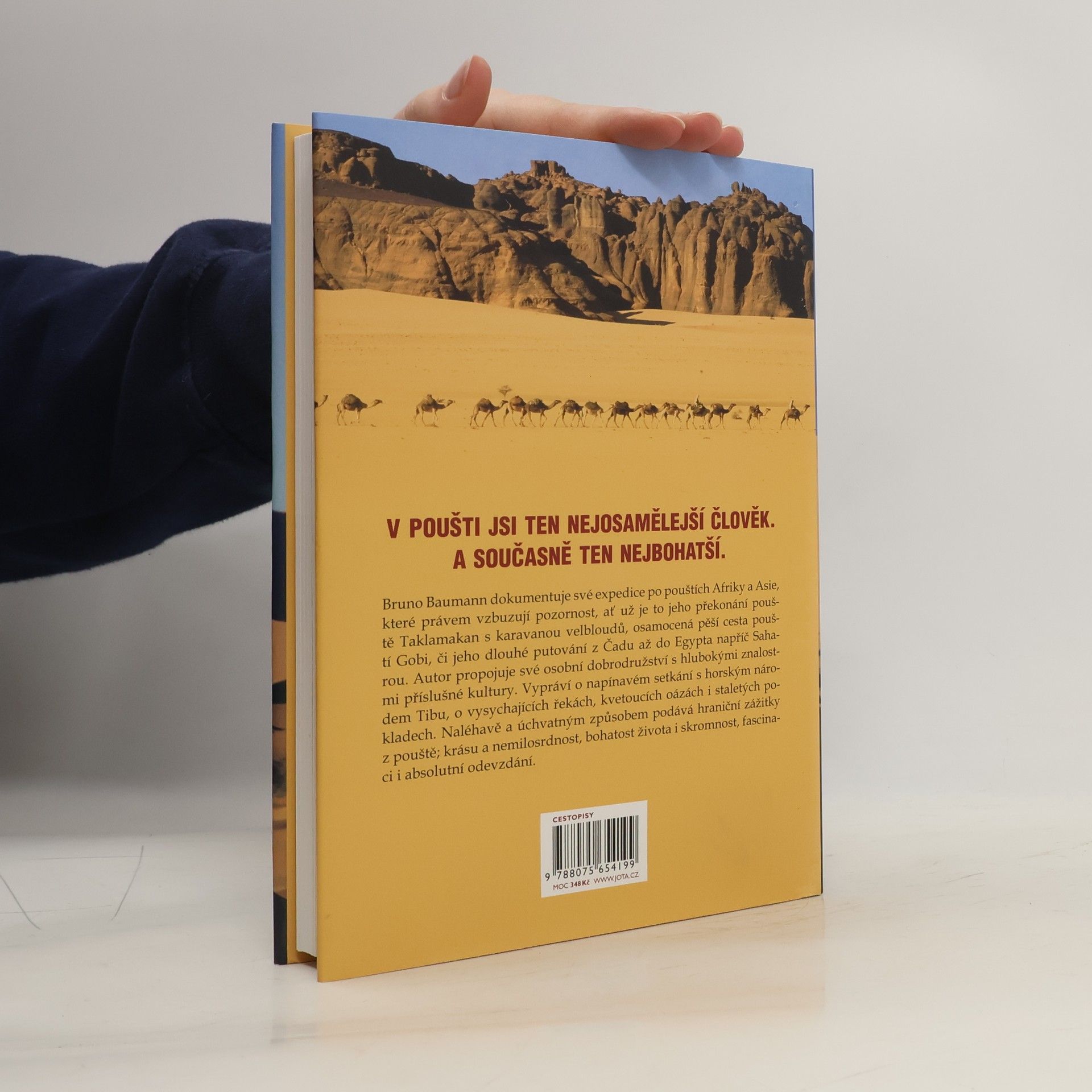 Dobrodruh a fotograf Bruno Baumann již více než dvacet let prochází ohromujícími krajinami písečných i horských pouští Afriky a Asie, které zažil tak intenzivně jako žádný jiný Evropan. V této knize dokumentuje své expedice po navštívených pouštích, které právem vzbuzují pozornost, ať už je to jeho překonání pouště Taklamakan s karavanou velbloudů, osamocená pěší cesta pouští Gobi či jeho dlouhé putování z Čadu až do Egypta napříč Saharou. Baumann propojuje své osobní dobrodružství s hlubokými znalostmi příslušné kultury a vypráví o napínavém setkání s horským národem Tubu, o vysychajících řekách, kvetoucích oázách i staletých pokladech. Naléhavě a úchvatným způsobem podává hraniční zážitky z pouště; krásu a nemilosrdnost, bohatost života i skromnost, fascinaci i absolutní odevzdání.