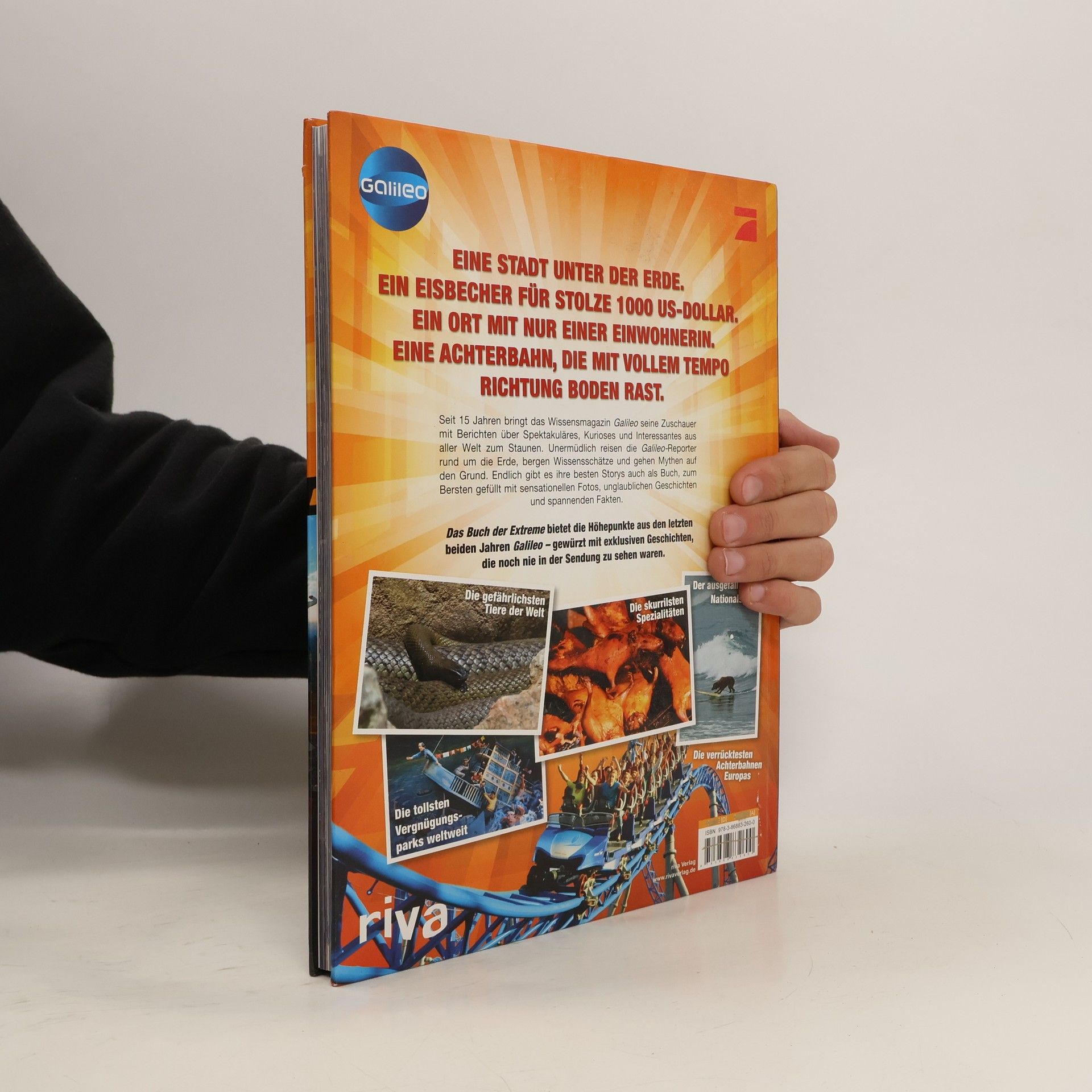 Eine Stadt unter der Erde. Ein Eisbecher für stolze 1000 US-Dollar. Ein Ort mit nur einer Einwohnerin. Eine Achterbahn, die mit vollem Tempo Richtung Boden rast. Seit 15 Jahren bringt das Wissensmagazin Galileo seine Zuschauer mit Berichten über Spektakuläres, Kurioses und Interessantes aus aller Welt zum Staunen. Unermüdlich reisen die Galileo-Reporter rund um die Erde, bergen Wissensschätze und gehen Mythen auf den Grund. Endlich gibt es ihre besten Storys auch als Buch, zum Bersten gefüllt mit sensationellen Fotos, unglaublichen Geschichten und spannenden Fakten. Das Buch der Extreme bietet die Höhepunkte aus den letzten beiden Jahren Galileo – gewürzt mit exklusiven Geschichten, die noch nie in der Sendung zu sehen waren.