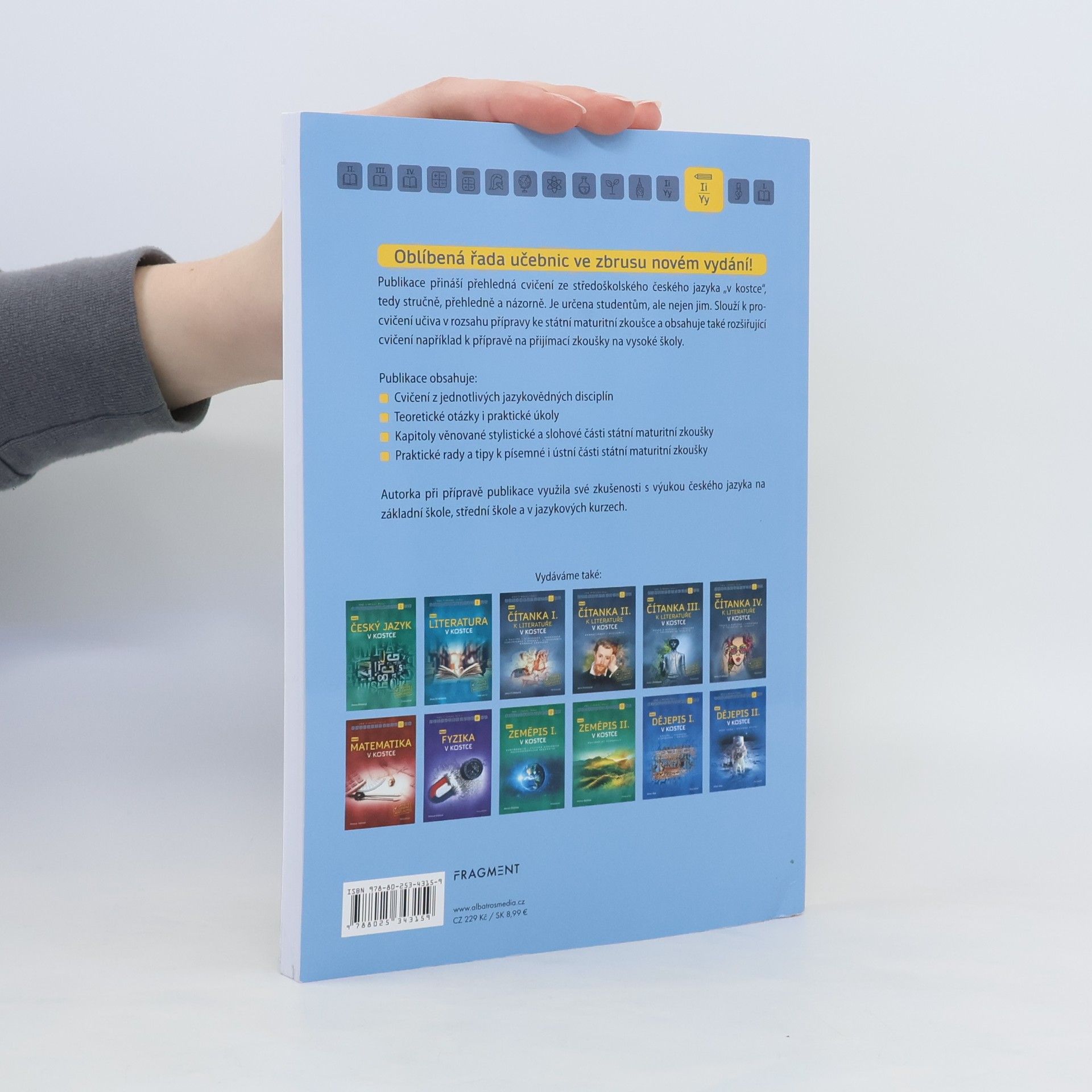 Oblíbená řada učebnic ve zbrusu novém přepracovaném vydání! Publikace přináší přehledná cvičení ze středoškolského českého jazyka „v kostce“, tedy stručně, přehledně a názorně. Je určena studentům, ale nejen jim. Slouží k procvičení učiva v rozsahu přípravy ke státní maturitní zkoušce a obsahuje také rozšiřující cvičení například k přípravě na přijímací zkoušky na vysoké školy. Publikace obsahuje: • Cvičení z jednotlivých jazykovědných disciplín • Teoretické otázky i praktické úkoly • Kapitoly věnované stylistické a slohové části státní maturitní zkoušky • Praktické rady a tipy k písemné i ústní části státní maturitní zkoušky Autorka při přípravě publikace využila své zkušenosti s výukou českého jazyka na základní škole, střední škole a v jazykových kurzech.