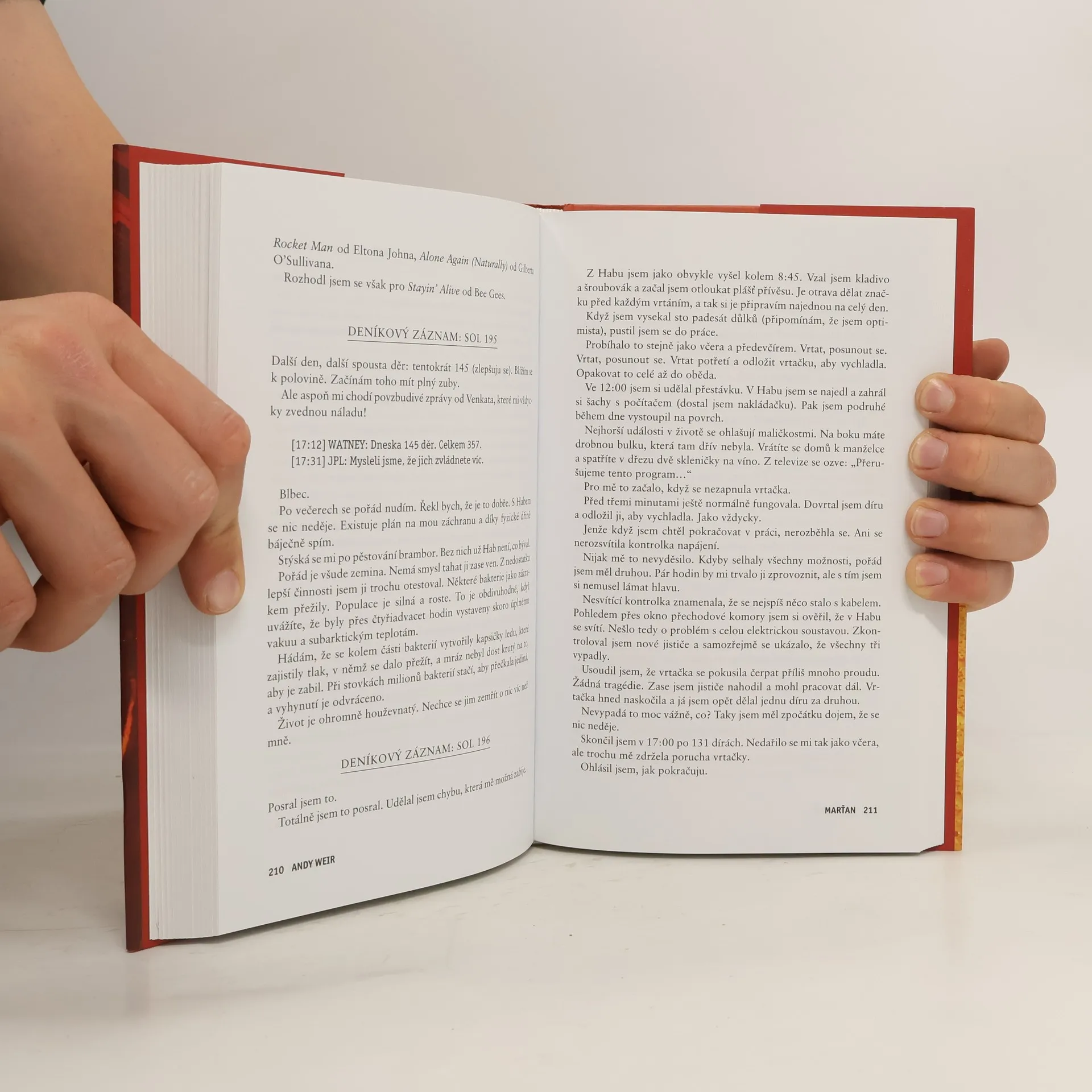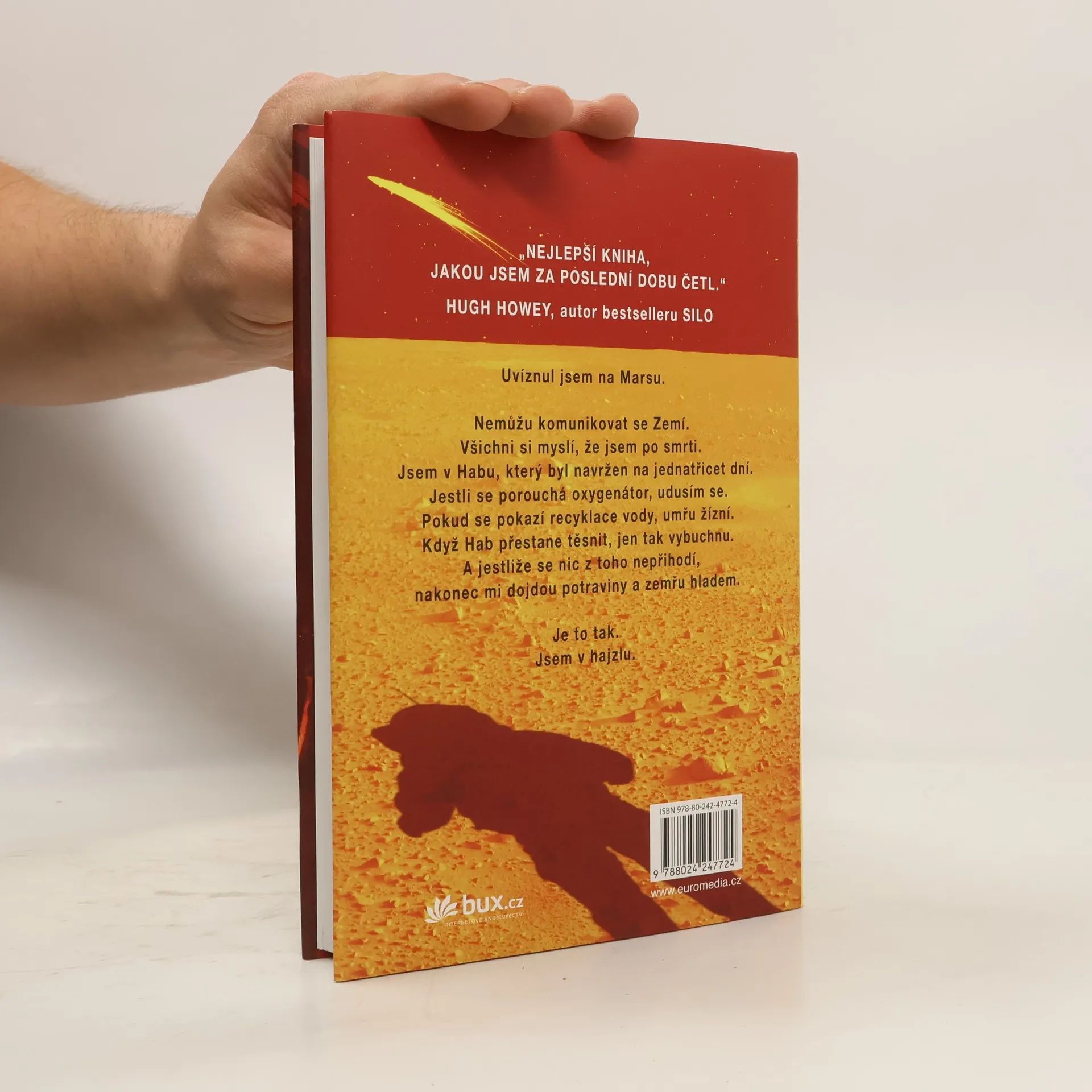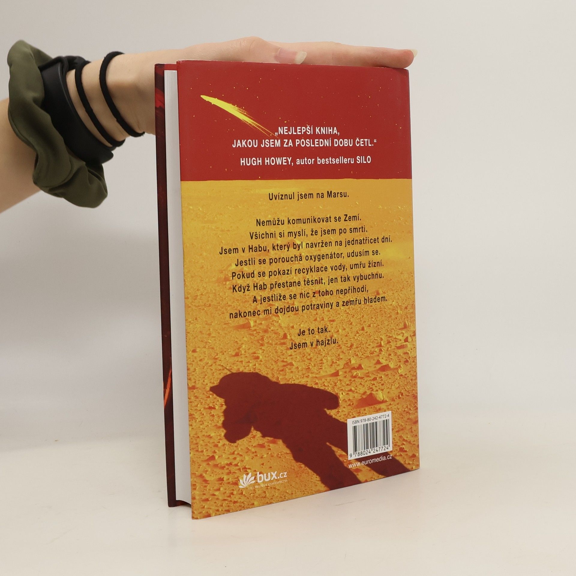 Je nejslavnějším mužem na Zemi. Má to však háček: není na Zemi… Před šesti dny se Mark Watney jako jeden z prvních lidí prošel po Marsu. Teď je přesvědčený, že bude prvním člověkem, který tam zemře. Málem zahynul v prašné bouři a zbytek jeho posádky odletěl v domnění, že je mrtvý. Mark nemá jak odeslat zprávu, že přežil. A i kdyby se s lidmi na Zemi spojit dokázal, zásoby mu dojdou mnohem dřív, než by stačila dorazit pomoc. Mark se však nevzdává. Vyzbrojen pouze svým důvtipem, technickými dovednostmi a nevyčerpatelným smyslem pro humor, který se pro něj stane nejcennějším zdrojem síly, se pouští do tvrdošíjného boje o přežití. Jak zdolává jednu zdánlivě nepřekonatelnou překážku za druhou, začíná věřit, že by na cizí planetě přece jen mohl obstát. Jenže Mars mu ještě přichystá nejedno překvapení… Strhující, podmanivý a přesvědčivý příběh o lidské nezdolnosti a vynalézavosti tváří v tvář beznadějné situaci obletěl celý čtenářský svět a ve všech zemích, kde vychází, sklízí nadšený ohlas. Zaujal i filmové tvůrce, režisér Ridley Scott točí adaptaci s Mattem Damonem v hlavní roli.