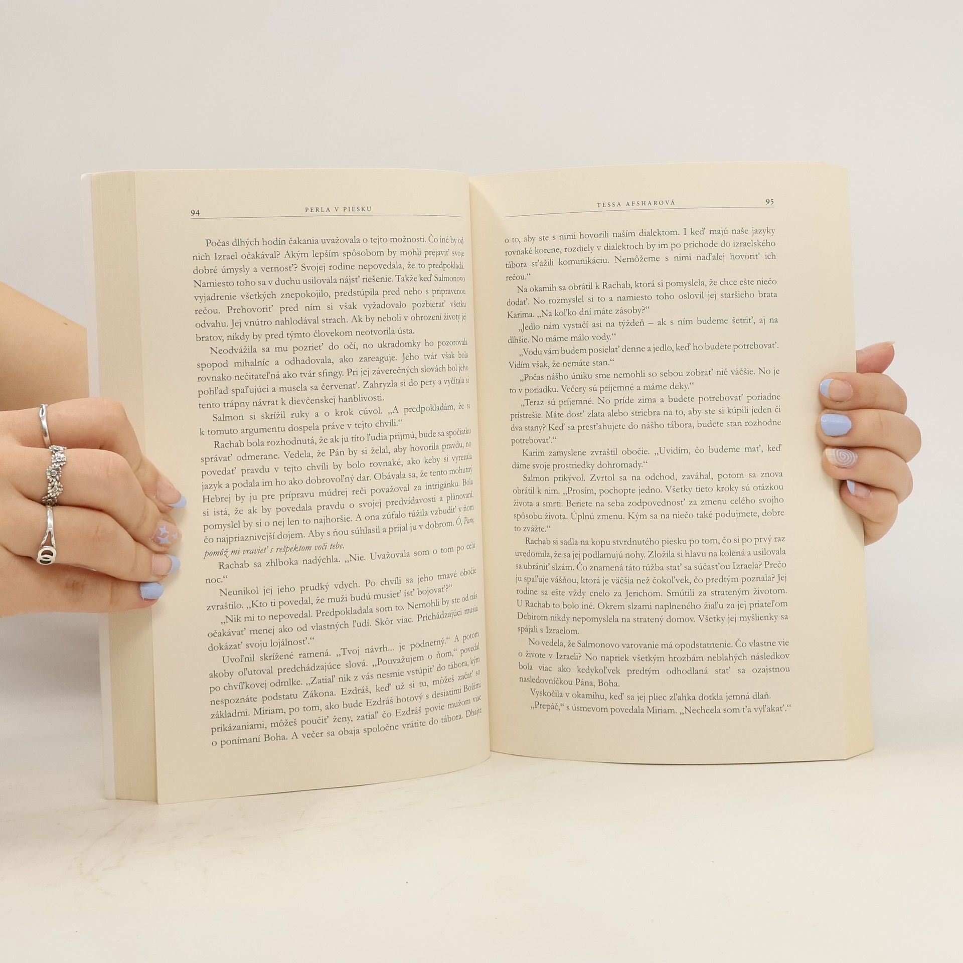 Pozoruhodná krása si vyžiada svoju daň. Rachab to zistila, keď ju ako pätnásťročnú predal na prostitúciu jediný muž, ktorého ľúbila a dôverovala mu – jej otec. Vďaka svojej inteligencii a starostlivému plánovaniu bola v tom, čo jej zraňovalo srdce, úspešná a v mladom veku dosiahla nezávislosť. A zaprisahala sa, že už nikdy nebude dôverovať mužovi. Žiadnemu, nech už by to bol ktokoľvek. Boh mal iné plány. Do jej citovo zmäteného sveta vkročil Salmon, jeden z najpoprednejších vodcov Júdovho kmeňa, ktorého si vážil celý Izrael. Cnostný a hrdý, hlboko veriaci človek. Nepriateľ. Čo má robiť žena s poškvrnenou minulosťou, ak chce, aby ju muž ľúbil, no má pocit, že to už nie je možné? Múry Jericha sú len začiatkom. Najdôležitejší boj sa odohráva v Rachabinom srdci.