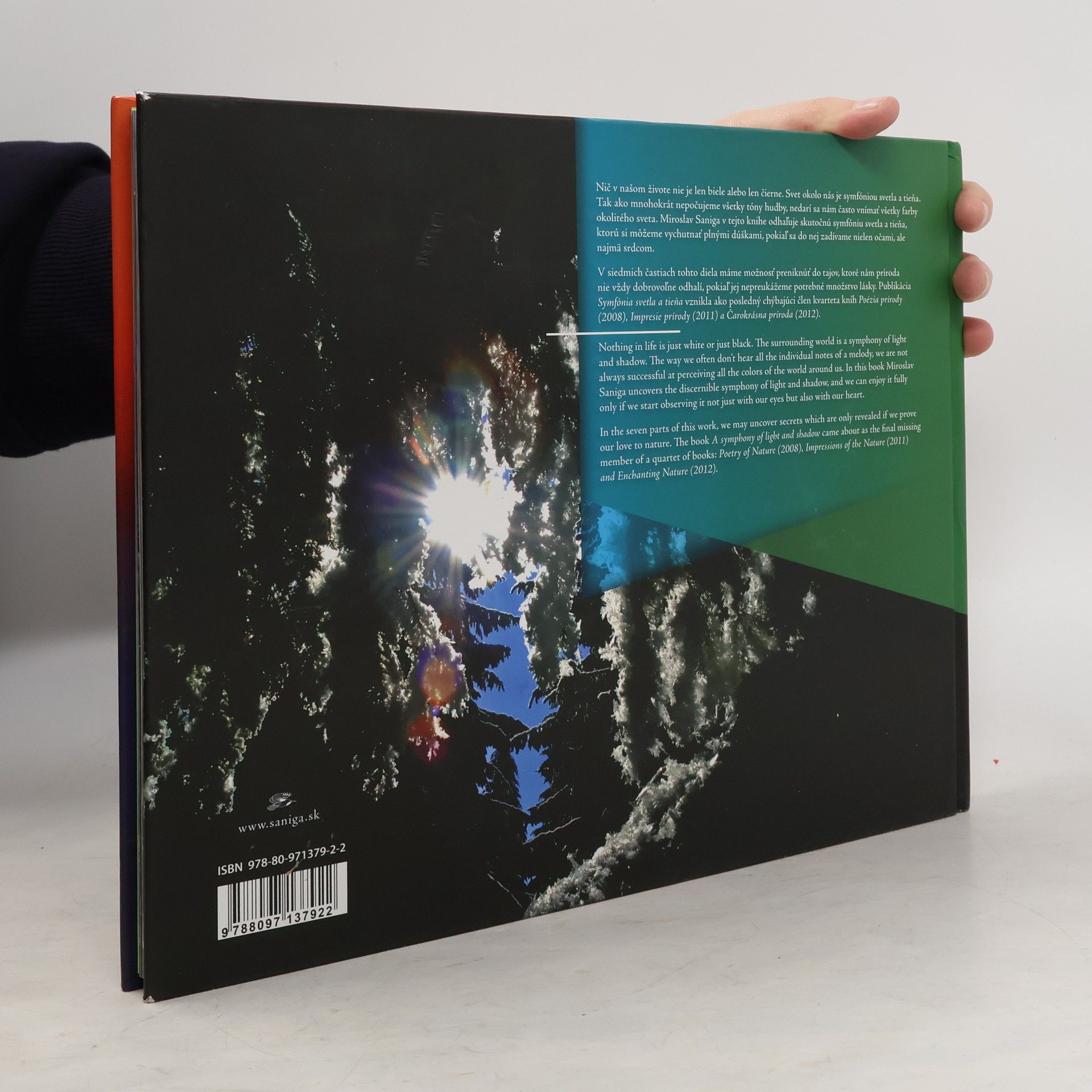 Nič v našom živote nie je len biele alebo len čierne. Svet okolo nás je symfóniou svetla a tieňa. Tak ako mnohokrát nepočujeme všetky tóny hudby, nedarí sa nám často vnímať všetky farby okolitého sveta. Miroslav Saniga v tejto knihe odhaľuje skutočnú symfóniu svetla a tieňa, ktorú si môžeme vychutnať plnými dúškami, pokiaľ sa do nej zadívame nielen očami, ale najmä srdcom. V siedmich častiach tohto diela máme možnosť preniknúť do tajov, ktoré nám príroda nie vždy dobrovoľne odhalí, pokiaľ jej nepreukážeme potrebné množstvo lásky. Publikácia Symfónia svetla a tieňa vznikla ako posledný chýbajúci člen kvarteta kníh Poézia prírody (2008), Impresie prírody (2011) a Čarokrásna príroda (2012).