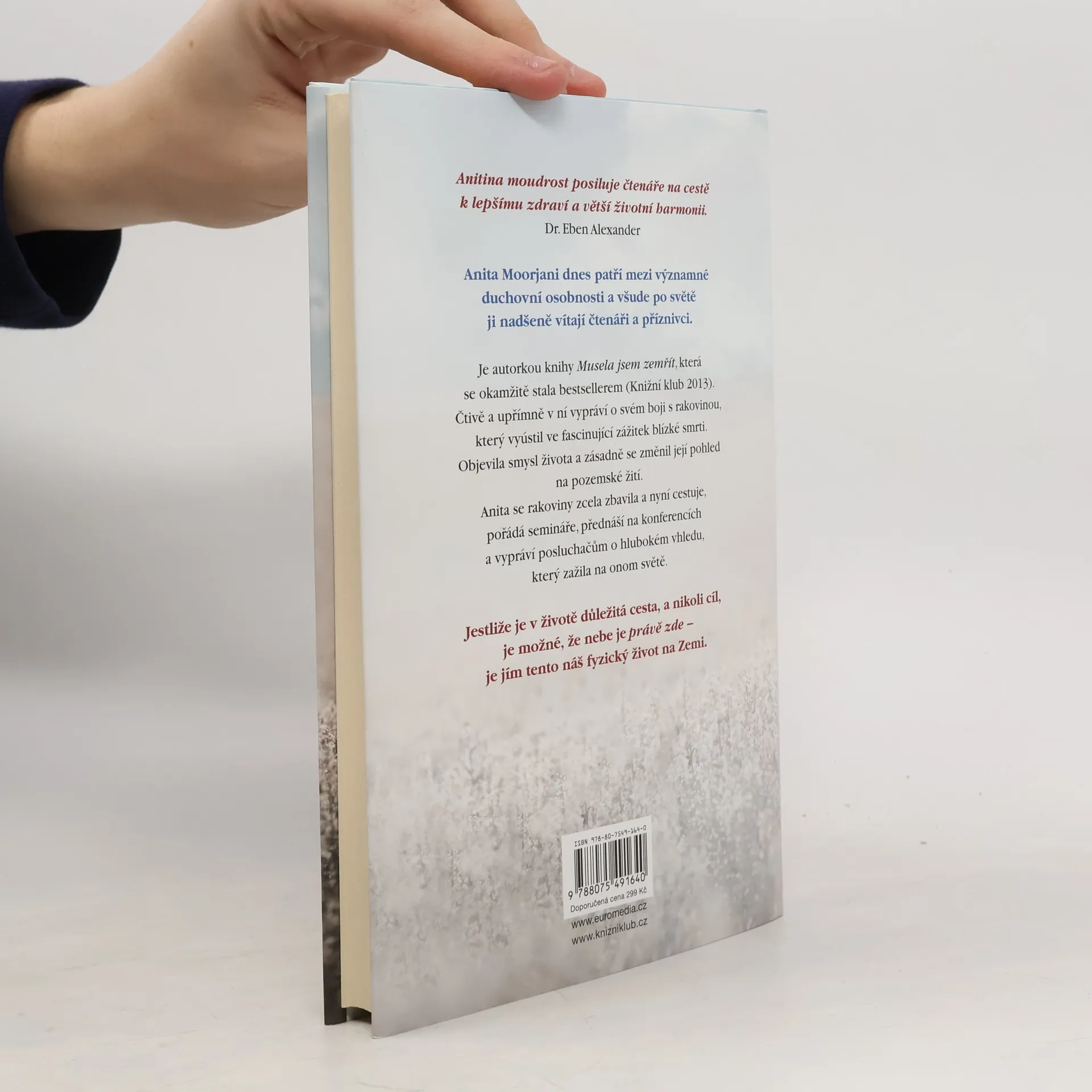 Anita Moorjani je autorkou knihy Musela jsem zemřít, která se stala bestsellerem (Knižní klub 2013). Popisuje v ní svůj boj s rakovinou, ústící ve fascinující zážitek blízké smrti. Ten dalekosáhle změnil její pohled na život. Anita se rakoviny zcela zbavila a nyní cestuje po světě, pořádá přednášky a semináře, přednáší na konferencích a vypráví posluchačům o hlubokém vhledu, který zažila na onom světě. Je-li v životě důležitá cesta, a nikoli cíl, je možné, že nebe je zde - je jím tento fyzický život, který žijeme na Zemi.