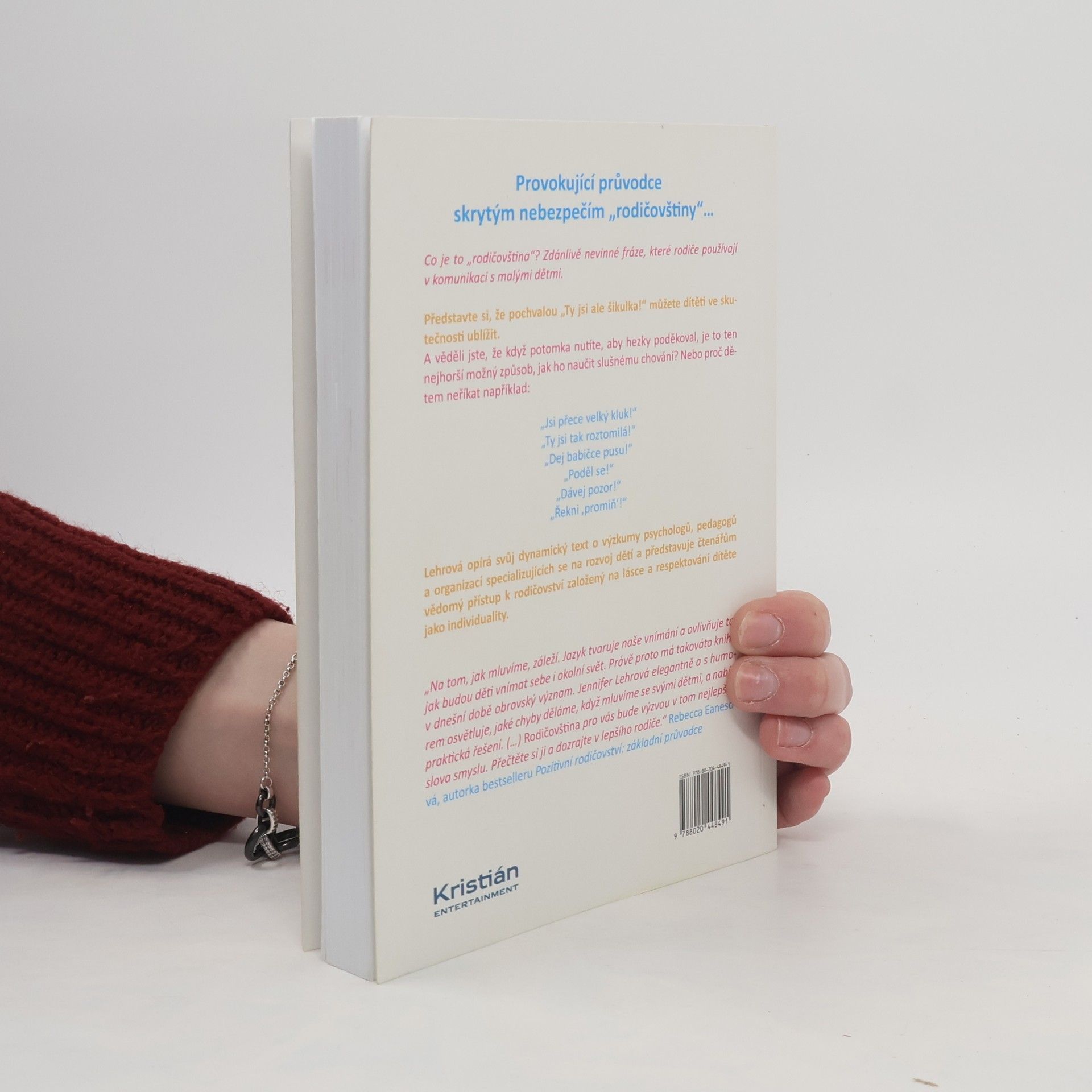 Co je to ,,rodičovština"? Zdánlivě nevinné fráze, které rodiče používají v komunikaci s malými dětmi. Představte si, že pochvalou ,,To se ti moc povedlo"! můžete dítěti ve skutečnosti ublížit. A věděli jste, že když potomka nutíte, aby hezky poděkoval, je to ten nejhorší možný způsob, jak ho naučit slušnému chování? Jennifer Lehrová je chytrá, vtipná a nebojácná autorka, která ,,převrátí vzhůru nohama všechny vaše zažité představy o rodičovství." ( Jennifer Jason Leighová). Lehrová opírá svůj dynamický text o výzkumy psychologů, pedagogů a organizací specializujících se na rozvoj dětí a představuje čtenářům vědomý přístup k rodičovství založený na lásce a respektování dítěte jako individuality.