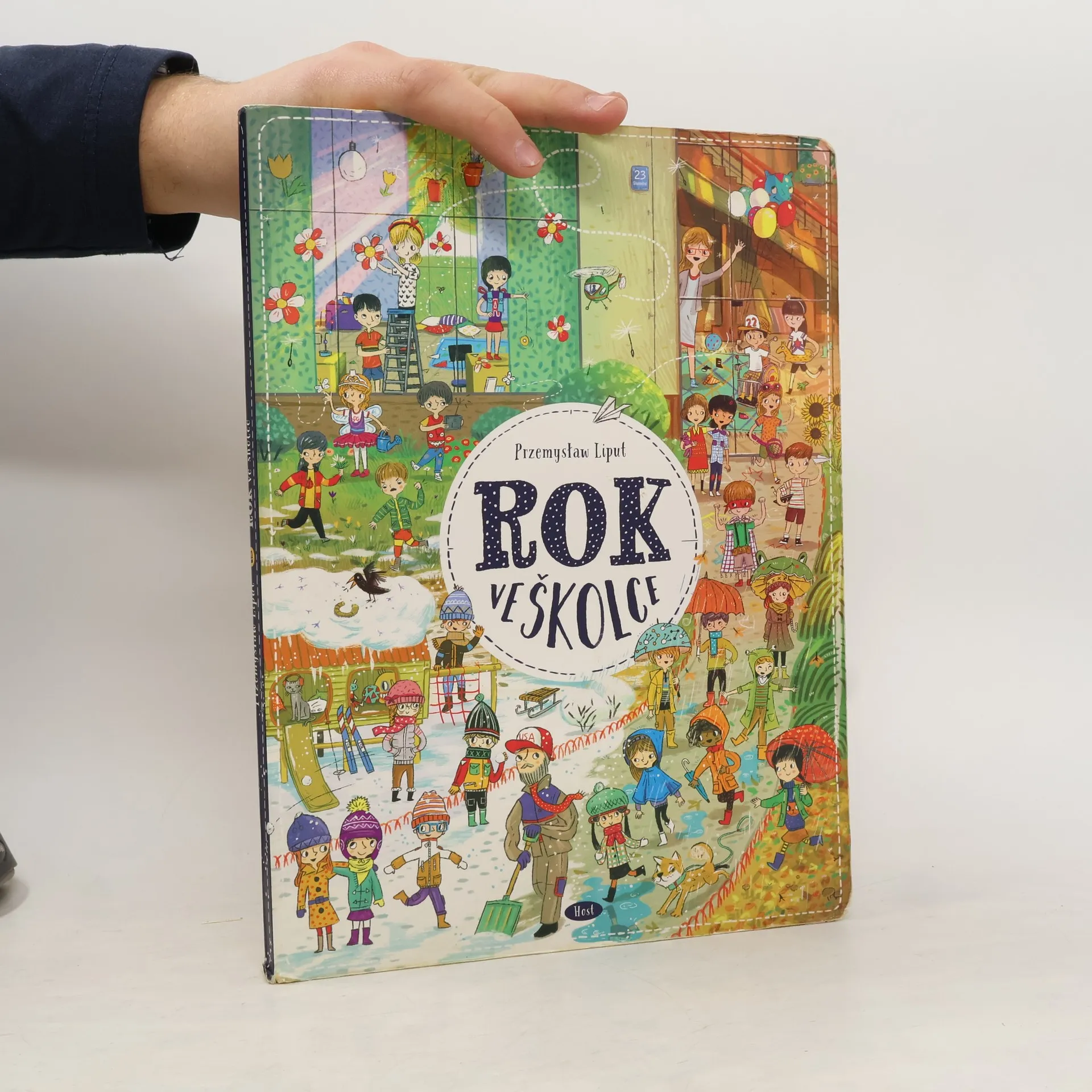 Vítej v naší školce! Tady se učíme, hrajeme si a občas vyvádíme skopičiny. Lukáš má rád fotbal, Tomáš je zase odborník na dinosaury. Evička pořád něco ztrácí a Ivanka ráda pořádá čajové dýchánky pro panenky. Jirku zajímá vesmír a vesmírné lodě a jednou z něj bude kosmonaut. Naše paní učitelka se jmenuje Květa. Pak je tu s námi ještě pan Janda, který umí všechno opravit, a jeho pes Alík. Staráme se taky o kočičku Micku – ta darebačka se pořád někde schovává a my ji hledáme. Pojď se s námi skamarádit! Chodit do školky je zábava. Rok ve školce obsahuje dvanáct bohatě ilustrovaných dvoustran, které dětem ukazují, co všechno se dá v průběhu roku – od září do letních prázdnin – zažít ve školce. Děti si díky detailním obrázkům procvičují postřeh a schopnost vyprávět příběhy, ale především se budou při zkoumání ilustrací výborně bavit.