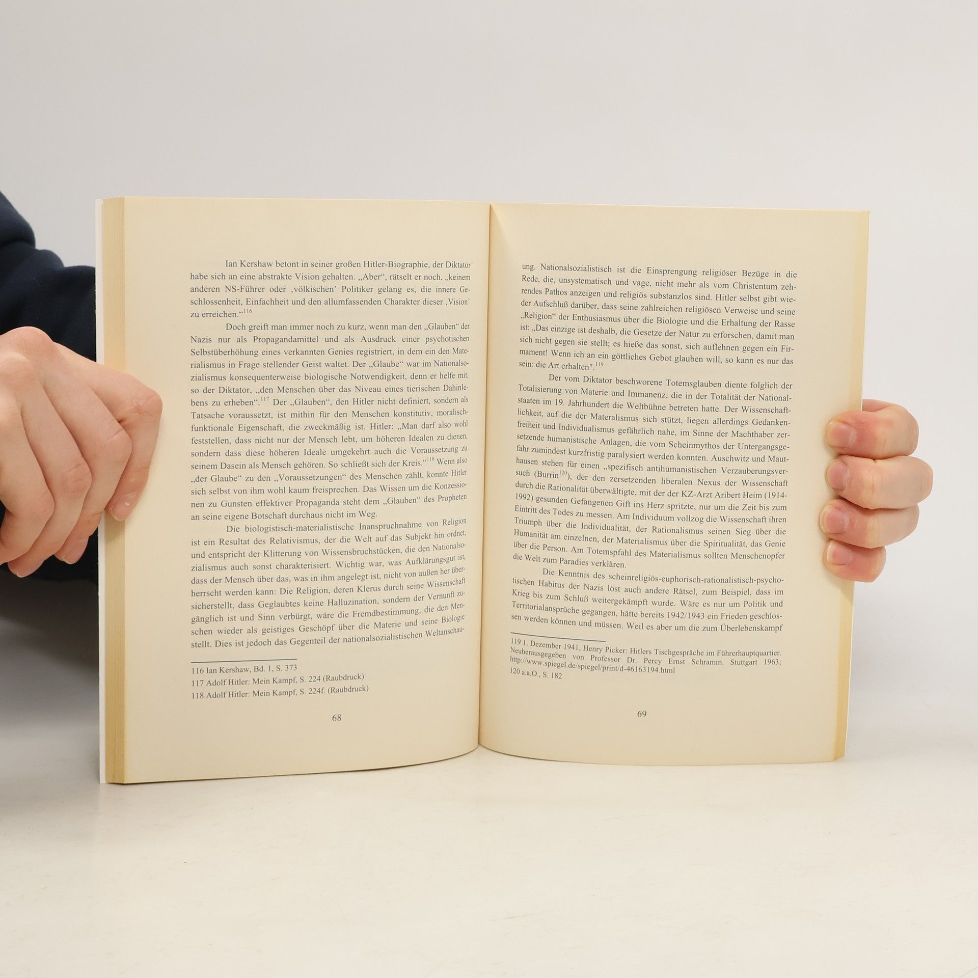 Der Erfolg des Nationalsozialismus ist nicht durch seine Primitivität oder Dummheit erklärbar, sondern durch seine unbeschränkte Rationalität und totalen Materialismus, die den Menschen zu einem Ding machen. Seine „Ethik“ kennt keine Grenzen, da sie von rationalen Gründen geleitet wird. Was als richtig und ethisch gilt, ist das, was vernünftig und zweckmäßig ist, wodurch auch Verbrechen gerechtfertigt werden können. Die Rationalität der nationalsozialistischen Weltanschauung beansprucht eine Vernünftigkeit, die für den Dieb ebenso unwiderlegbar erscheint wie der Diebstahl selbst. Der kategorische Imperativ Kants schützt nicht vor Verbrechen, wenn diese rational begründet werden, etwa durch Rassegesetze zur Verbesserung des Genoms im „Kampf der Völker“. Nationalsozialismus erweist sich als „vernünftiger“ als gewöhnliche Verbrechen, da diese nicht zur Kategorie erhoben werden. Der kategorische Imperativ, der kleine Schandtaten verbietet, fördert die größeren. Das Dritte Reich war somit kein Unfall, sondern das Ergebnis der Entspiritualisierung der Gesellschaft und der Aufklärung des 19. Jahrhunderts. Der nationalsozialistische Mythos vom „Kampf der Völker“ ist ein Scheinmythos, der die inhumane Realität des Systems emotional auflädt. Der Vergleich von Kants und Hitlers Programmschriften zeigt, dass die These vom Nationalsozialismus als „politischer Religion“ irreführend ist und der Wissenschaftlichen Subjektivismus dient. Die Un
