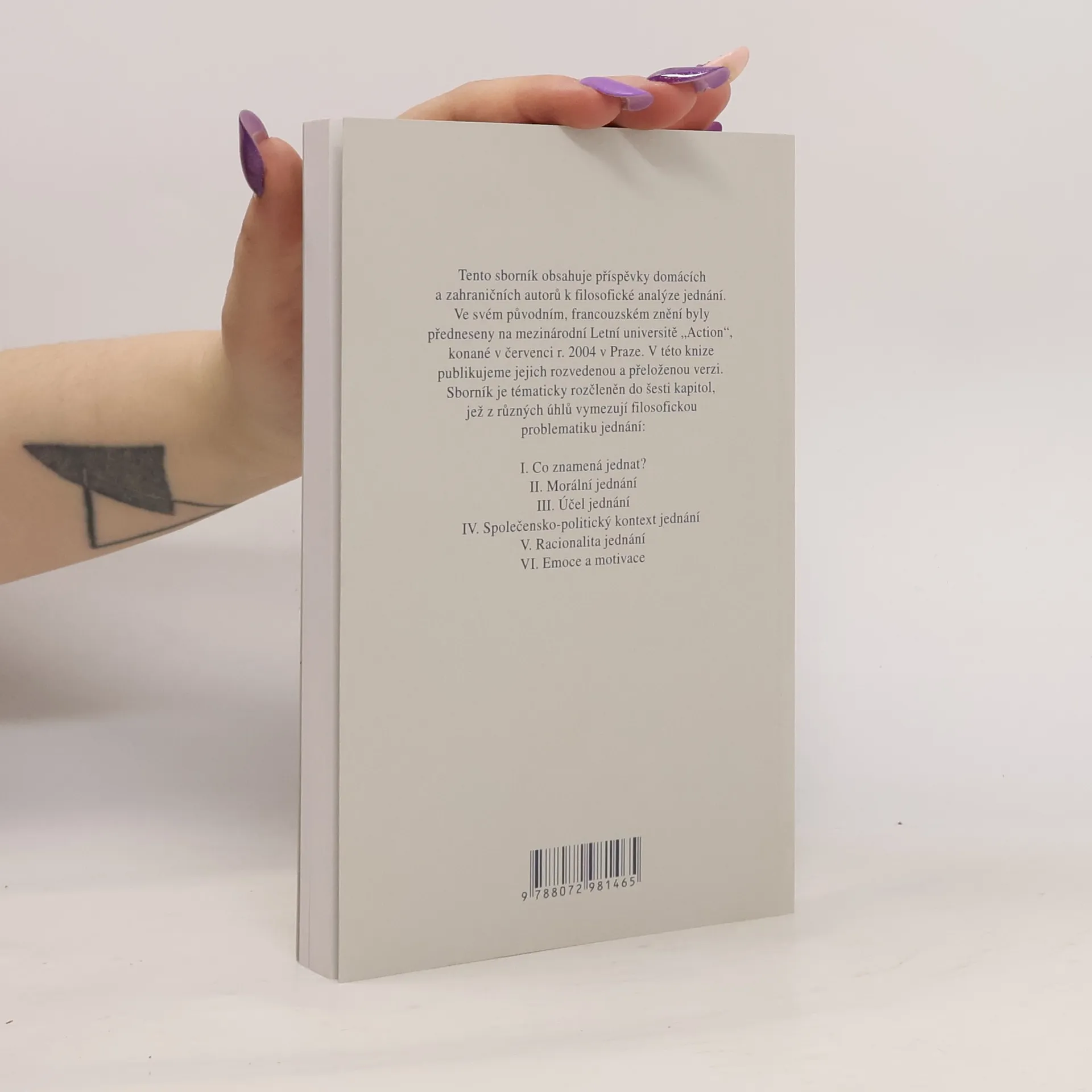 Sborník příspěvků k filosofickému rozboru jednání se člení do pododdílu “motivace a emoce”, “pravidla a kontext”, “racionalita jednaní”, “mluvit a jednat”. Jejich autoři v nich shrnují výsledky své práce k danému problému (F. Karfík, J. Sokol, J. Čapek, O. Švec, F. Wolff, P. Canivez, B. Znepolski, S. Virvidakis, P. Kontos).