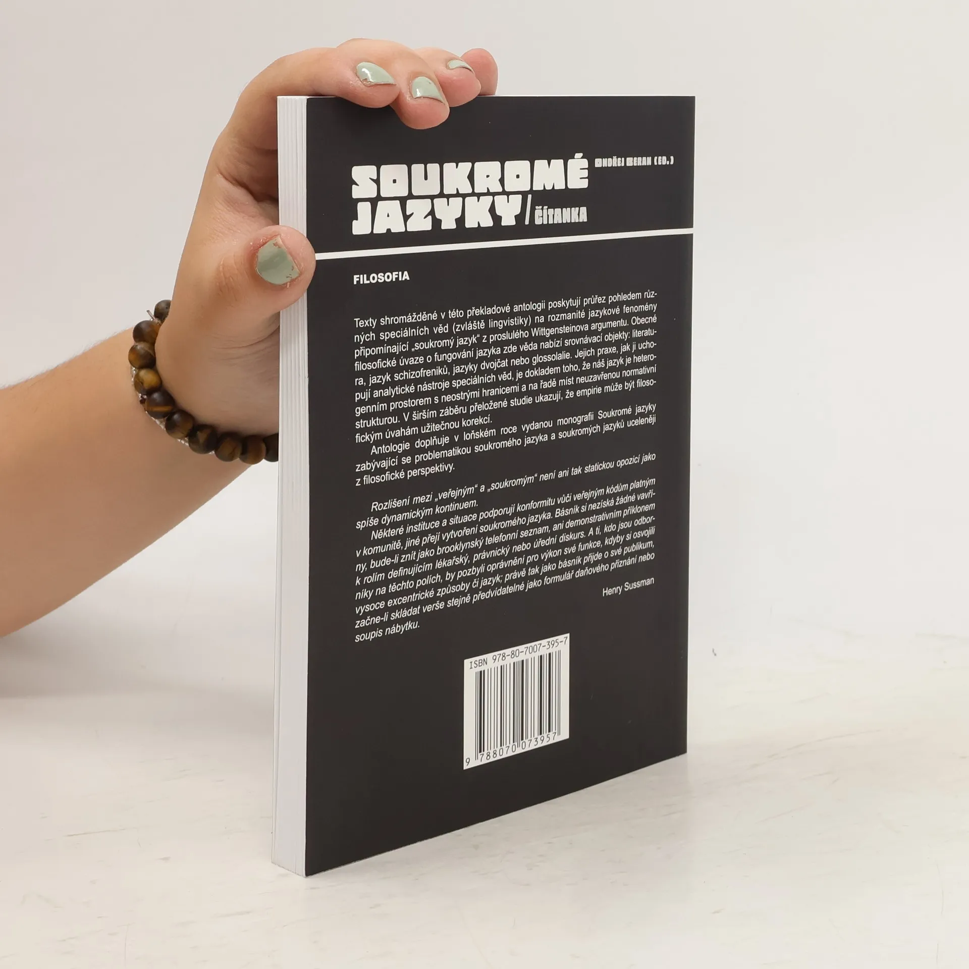 Sborník překladů představuje výběr textů analyzujících nejcharakterističtější příklady „soukromých jazyků“ nejen z úzké obecně analytické perspektivy filosofie, ale především z hlediska speciálních věd, zvláště lingvistiky. Antologii, která je doplňkem k monografii Soukromé jazyky (Filosofia 2012), doprovází překladatelova úvodní studie.
