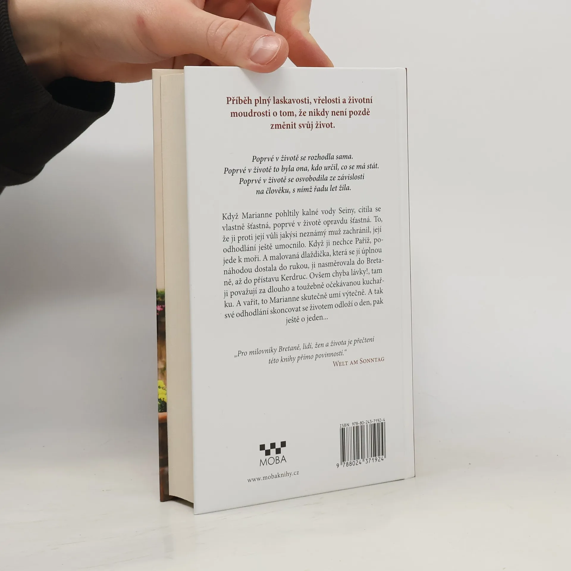 Příběh plný laskavosti, vřelosti a životní moudrosti o tom, že nikdy není pozdě změnit svůj život. Když Marianne pohltily kalné vody Seiny, cítila se vlastně šťastná, poprvé v životě opravdu šťastná. To, že ji proti její vůli jakýsi neznámý muž zachránil, její odhodlání ještě umocnilo. Když ji nechce Paříž, pojede k moři. A malovaná dlaždička, která se jí úplnou náhodou dostala do rukou, ji nasměrovala do Bretaně, až do přístavu Kerdruc. Ovšem chyba lávky!, tam ji považují za dlouho a toužebně očekávanou kuchařku. A vařit, to Marianne skutečně umí výtečně. A tak své odhodlání skoncovat se životem odloží o den, pak ještě o jeden...