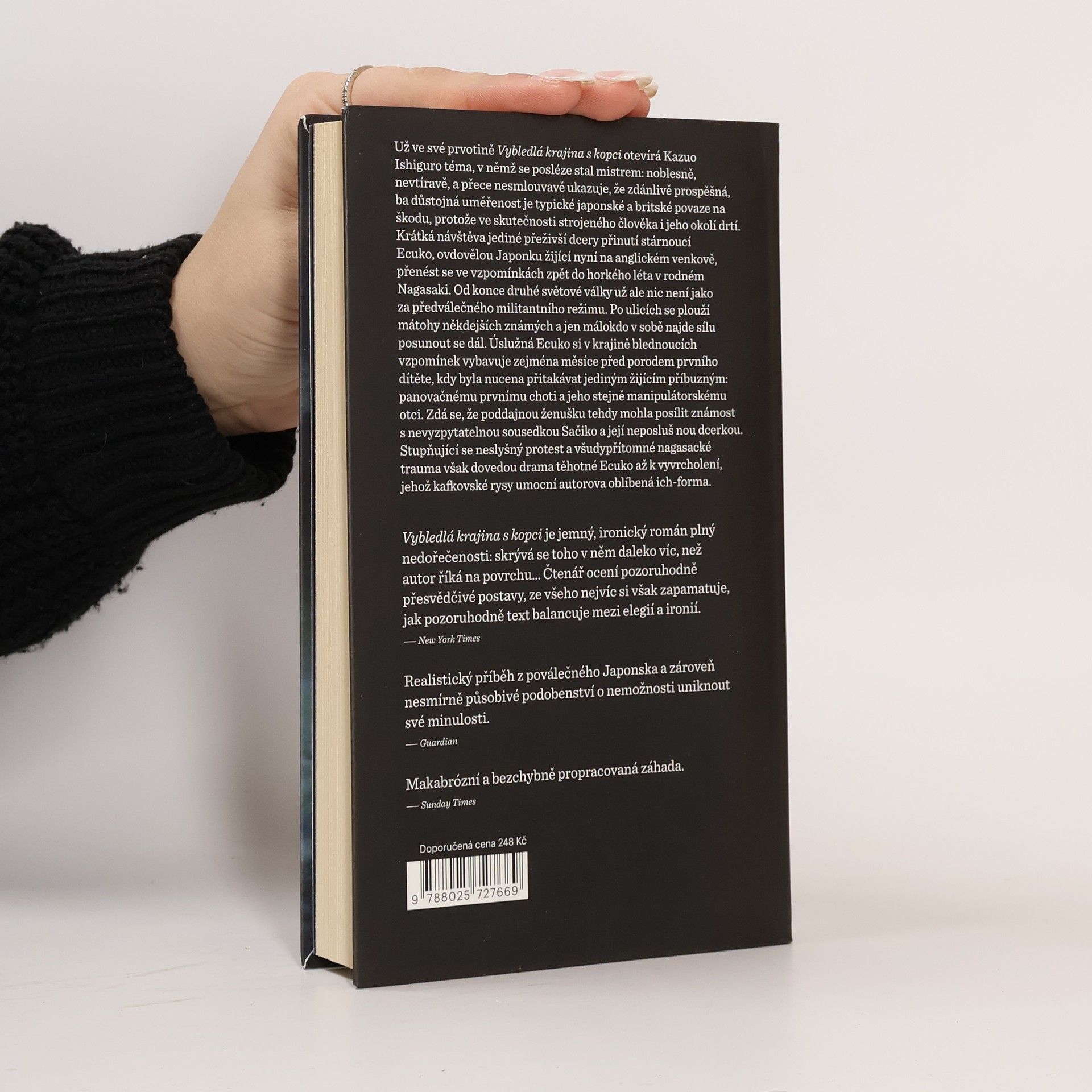 Už v prvotině Vybledlá krajina s kopci držitel Nobelovy ceny za rok 2017 Kazuo Ishiguro noblesně, nevtíravě, a přece nesmlouvavě vykresluje zdánlivě prospěšnou, ba důstojnou uměřenost japonské a britské povahy a zjišťuje, že je jejím nositelům spíše na škodu, protože ve skutečnosti odtažitého člověka i jeho okolí drtí. Krátká návštěva jediné přeživší dcery přinutí stárnoucí Ecuko přenést se ve vzpomínkách zpět do horkého léta v rodném Nagasaki. Na sklonku druhé světové války se tu duše jejích spoluobčanů změnily k nepoznání. Po ulicích se ploužily mátohy někdejších známých a jen málokdo v sobě našel sílu posunout se dál. Ecuko si vybavuje zejména měsíce před porodem prvního dítěte, kdy byla nucena přitakávat jediným žijícím příbuzným: panovačnému prvnímu choti a jeho stejně manipulátorskému otci. Poddajnou ženušku tehdy snad mohla posílit známost s nevyzpytatelnou sousedkou Sačiko a její neposlušnou dcerkou, které chtěly z města vypálených stínů za každou cenu pryč. Stupňující se neslyšný protest a všudypřítomné nagasacké trauma dovedly drama těhotné Ecuko ke kafkovskému vyvrcholení.